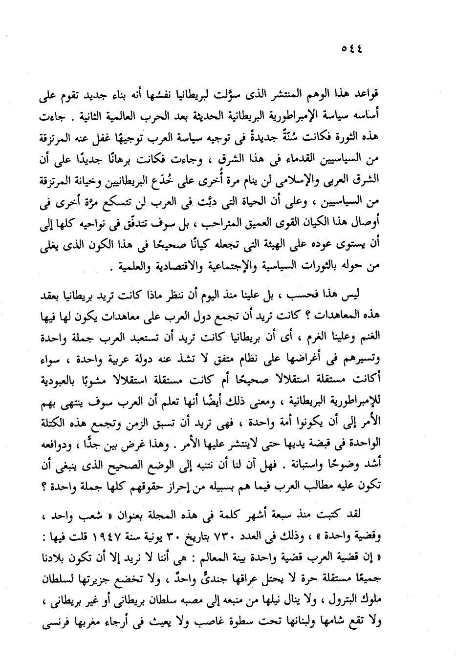 ليس هذا فحسب، بل علينا منذ اليوم أن ننظر ماذا كانت تريد بريطانيا بعقد هذه المعاهدات؟ كانت تريد أن تجمع دول العرب على معاهدات يكون لها فيها الغنم وعلينا الغرم، أي أن بريطانيا كانت تريد أن تستعبد العرب جملة واحدة وتسيرهم في أغراضها على نظام متفق لا تشذ عنه دولة عربية واحدة، سواء أكانت مستقلة استقلالا صحيحًا أم كانت مستقلة استقلالا مشوبًا بالعبودية للإمبراطورية البريطانية، ومعنى ذلك أيضًا أنها تعلم أن العرب سوف ينتهي بهم الأمر إلى أن يكونوأ أمة واحدة، فهي تريد أن تسبق الزمن وتجمع هذه الكتلة الواحدة في قبضة يديها حتى لا ينتشر عليها الأمر. وهذا غرض بين جدًّا، ودوافعه أشد وضوحًا واستبانة. فهل آن لنا أن نتنبه إلى الوضع الصحيح الذي ينبغي أن تكون عليه مطالب العرب فيما هم بسبيله من إحراز حقوقهم كلها جملة واحدة؟