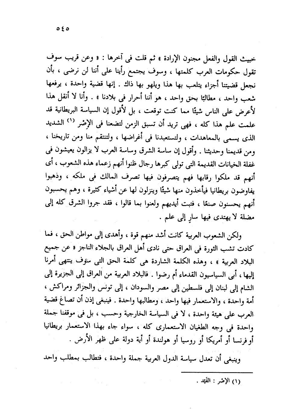 ولكن الشعوب العربية كانت أشد منهم قوة، وأهدى إلى مواطن الحق، فما كادت تشب الثورة في العراق حتى نادى أهل العراق بالجلاء الناجز "عن جميع البلاد العربية"، وهذه الكلمة الشاردة هي كلمة الحق التي سوف ينتهي أمرنا إليها، أبى السياسيون القدماء أم رضوا. فالبلاد العربية من العراق إلى الجزيرة إلى الشام إلى لبنان إلى فلسطين إلى مصر والسودان، إلى تونس والجزائر ومراكش، أمة واحدة، والاستعمار فيها واحد، ومطالبها واحدة. فينبغي إذن أن تصاغ قضية العرب على هيئة واحدة، لا في السياسة الخارجية وحسب، بل في موقفنا جملة واحدة في وجه الطغيان الاستعماري كله، سواء جاء بهذا الاستعمار بريطانيا أو فرنسا أو أمريكا أو روسيا أو هولندة أو أية دولة على ظهر الأرض.