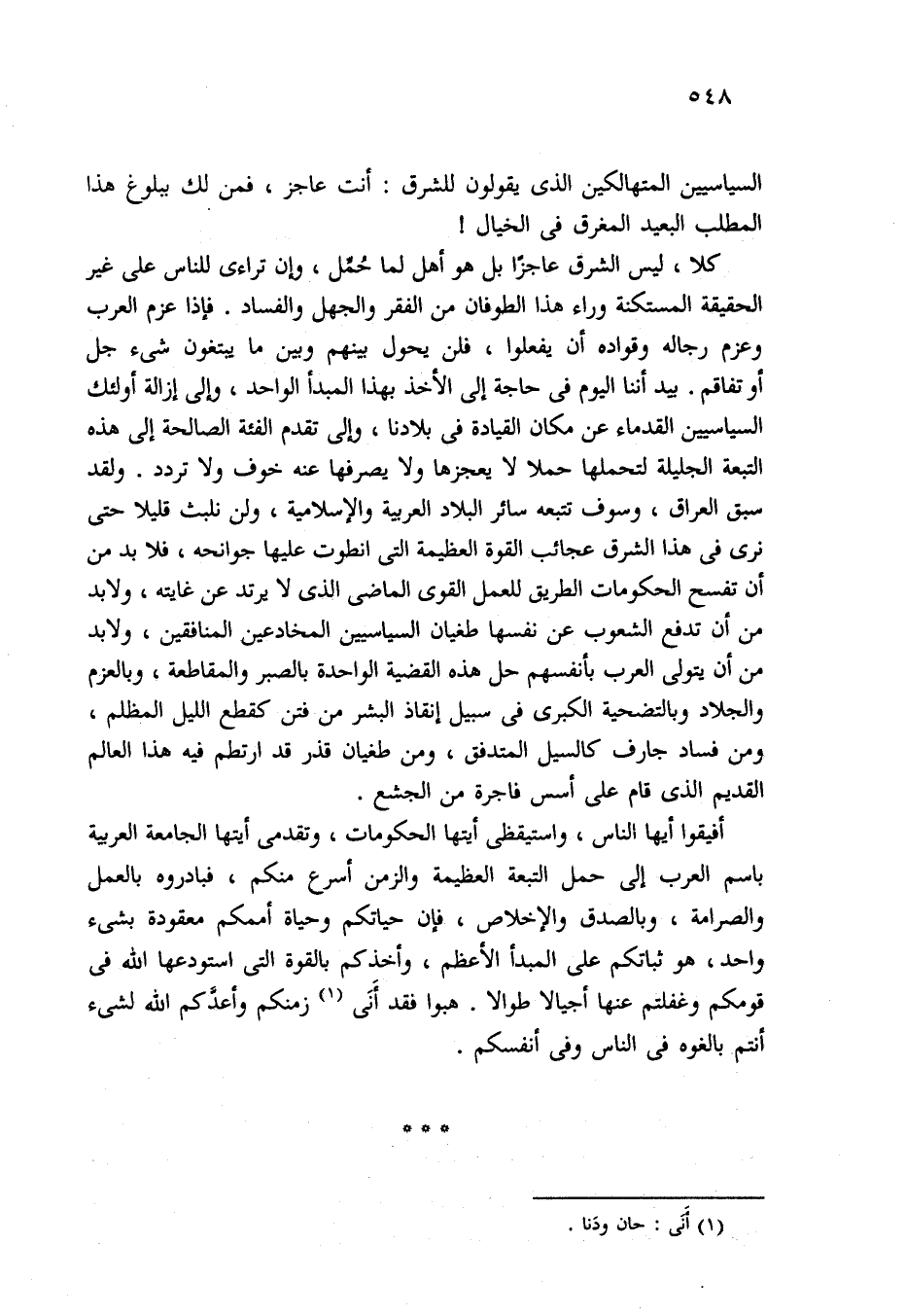 أفيقوا أيها الناس، واستيقظى أيتها الحكومات، وتقدمى أيتها الجامعة العربية باسم العرب الى حمل التبعة العظيمة والزمن أسرع منكم، فبادروه بالعمل والصرامة، وبالصدق والإخلاص، فإن حياتكم وحياة أممكم معقودة بشيء واحد، هو ثباتكم على المبدأ الأعظم، وأخذكم بالقوة التي استودعها الله في قومكم وغفلتم عنها أجيالا طوالا. هبوا فقد أَنَى (¬1) زمنكم وأعدَّكم الله لشيء أنتم بالغوه في الناس وفي أنفسكم.