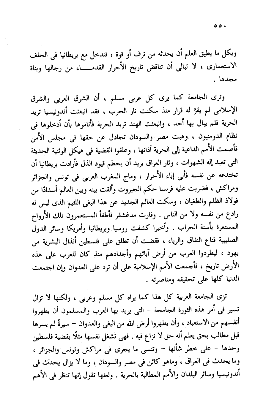 ترى الجامعة العربية كل هذا كما يراه كل مسلم وعربي، ولكنها لا تزال تسير في أمر هذه الثورة الجامحة -التي يريد بها العرب والمسلمون أن يطهروا أنفسهم من الاستعباد، وأن يطهروا أرض الله من البغى والعدوان- سيرةً لم يسرها قبل مطالب بحق يعلم أنه حق لا نزاع فيه. فهي تشغل نفسها مثلًا بقضية فلسطين وحدها -على خطر شأنها- وتنسى ما يجرى في مراكش وتونس والجزائر، وما يحدث في العراق، وما هو كائن في مصر والسودان، وما لا يزال يحدث في أندونيسيا وسائر البلدان والأمم المطالبة بالحرية. ولعلها تقول إنها تنظر في الأهم