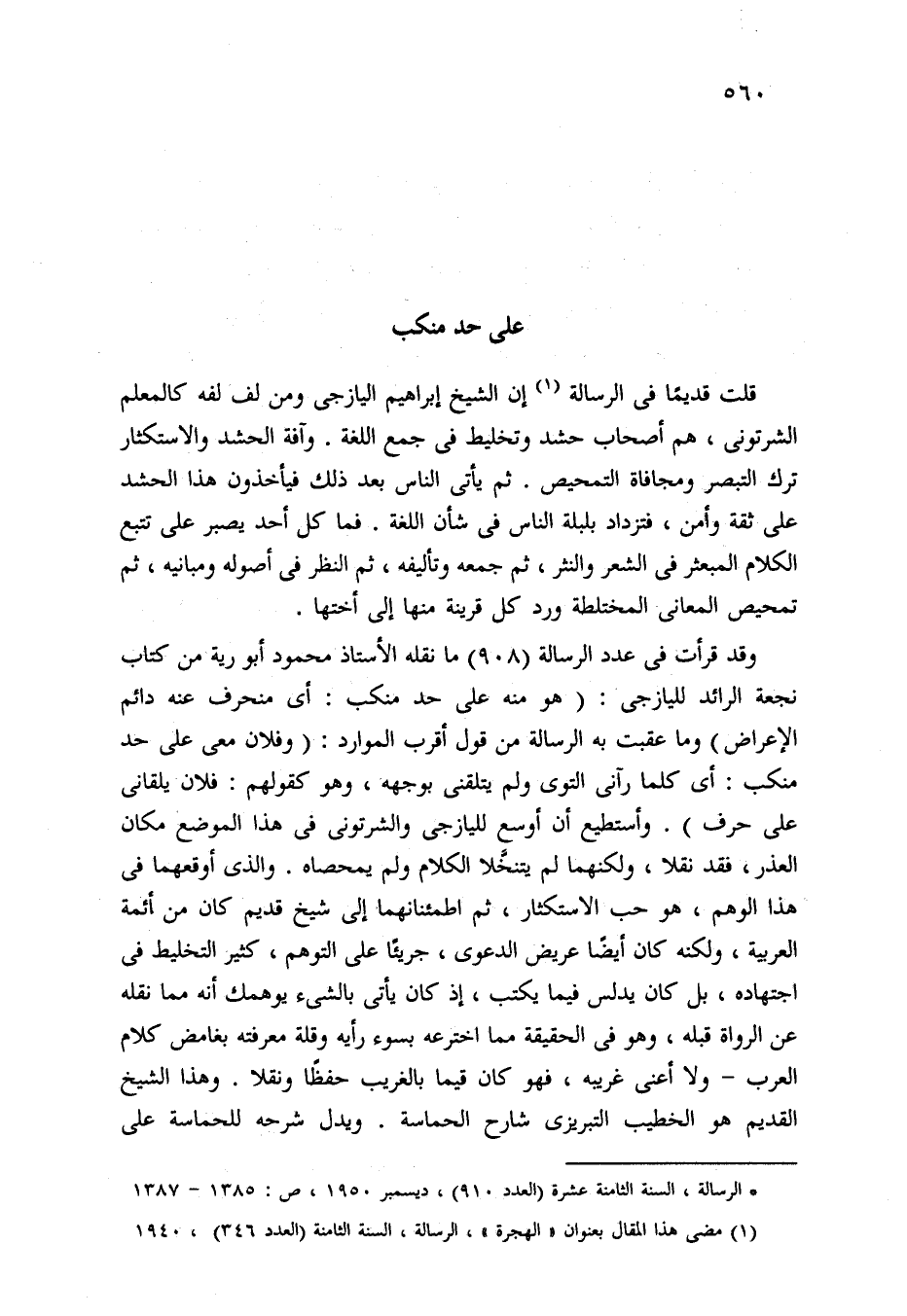 وقد قرأت في عدد الرسالة (908) ما نقله الأستاذ محمود أبو رية من كتاب نجعة الرائد لليازجى: (هو منه على حد منكب: أي منحرف عنه دائم الإعراض) وما عقبت به الرسالة من قول أقرب الموارد: (وفلان معى على حد منكب: أي كلما رآنى التوى ولم يتلقنى بوجهه، وهو كقولهم: فلان يلقانى على حرف). وأستطيع أن أوسع لليازجى والشرتونى في هذا الموضع مكان العذر، فقد نقلا، ولكنهما لم يتنخَّلا الكلام ولم يمحصاه. والذي أوقعهما في هذا الوهم، هو حب الاستكثار، ثم اطمئنانهما إلى شيخ قديم كان من أئمة العربية، ولكنه كان أيضًا عريض الدعوى، جريئًا على التوهم، كثير التخليط في اجتهاده، بل كان يدلس فيما يكتب، إذ كان يأتي بالشيء يوهمك أنه مما نقله عن الرواة قبله، وهو في الحقيقة مما اخترعه بسوء رأيه وقلة معرفته بغامض كلام العرب -ولا أعني غريبه، فهو كان قيما بالغريب حفظًا ونقلا. وهذا الشيخ القديم هو الخطيب التبريزى شارح الحماسة. ويدل شرحه للحماسة على