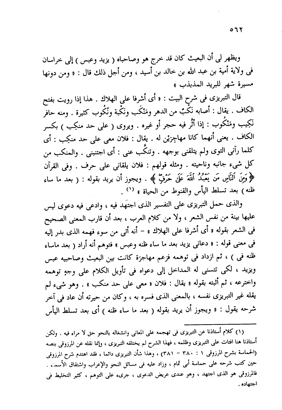 (¬1) كلام أستاذنا عن التبريزي في تهجمه على المعاني وانشغاله بالنحو حق لا مراء فيه. ولكن أستاذنا هنا افتات على التبريزى وظلمه، فهذا الشرح لم يختلقه التبريزى، وإنما نقله عن المرزوقى بنصه (الحماسة بشرح المرزوقى 1: 380 - 381)، وهذا شأن التبريزى دائما، فقد اهتدم شرح المرزوقى حين كتب شرحه على حماسة أبي تمام، وزاد عليه في مسائل النحو والإعراب واشتقاق الأسماء. فالمرزوقى هو الذي اجتهد، وهو عندي عريض الدعوى، جرئ على التوهم، كثير التخليط في اجتهاده.