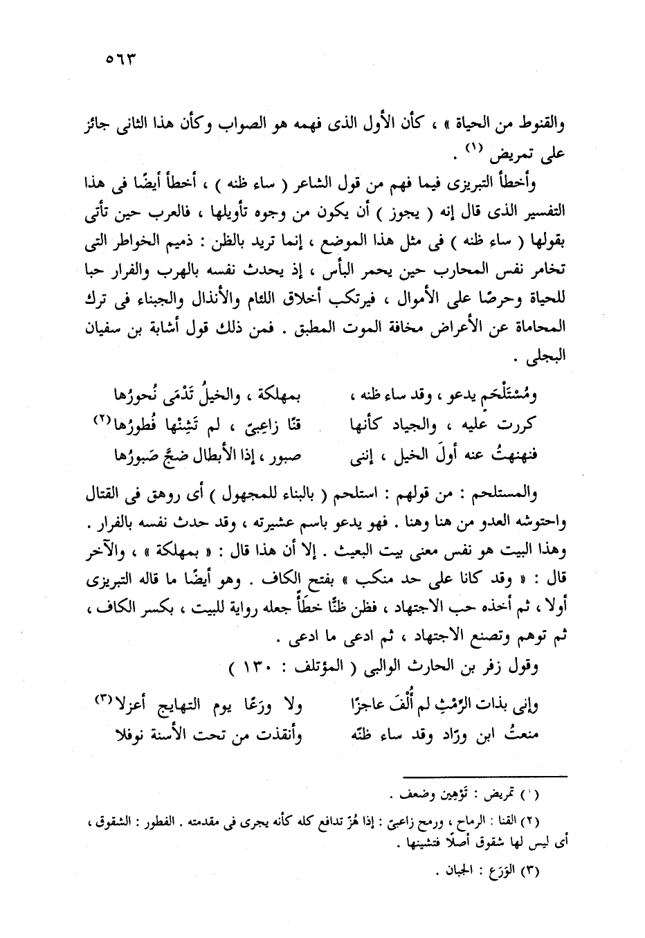 وأخطأ التبريزى فيما فهم من قول الشاعر (ساء ظنه)، أخطأ أيضًا في هذا التفسير الذي قال إنه (يجوز) أن يكون من وجوه تأويلها، فالعرب حين تأتي بقولها (ساء ظنه) في مثل هذا الموضع، إنما تريد بالظن: ذميم الخواطر التي تخامر نفس المحارب حين يحمر البأس، إذ يحدث نفسه بالهرب والفرار حبا للحياة وحرصًا على الأموال، فيرتكت أخلاق اللئام والأنذال والجبناء في ترك المحاماة عن الأعراض مخافة الموت المطبق. فمن ذلك قول أشابة بن سفيان البجلى.