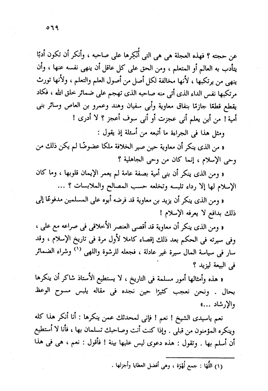 "هذه وأمثالها أمور مسلمة في التاريخ، لا يستطيع الأستاذ شاكر أن ينكرها بحال. ونحن نعجب كثيرًا حين نجده في مقاله يلبس مسوح الوعظ والإرشاد. . . ."
