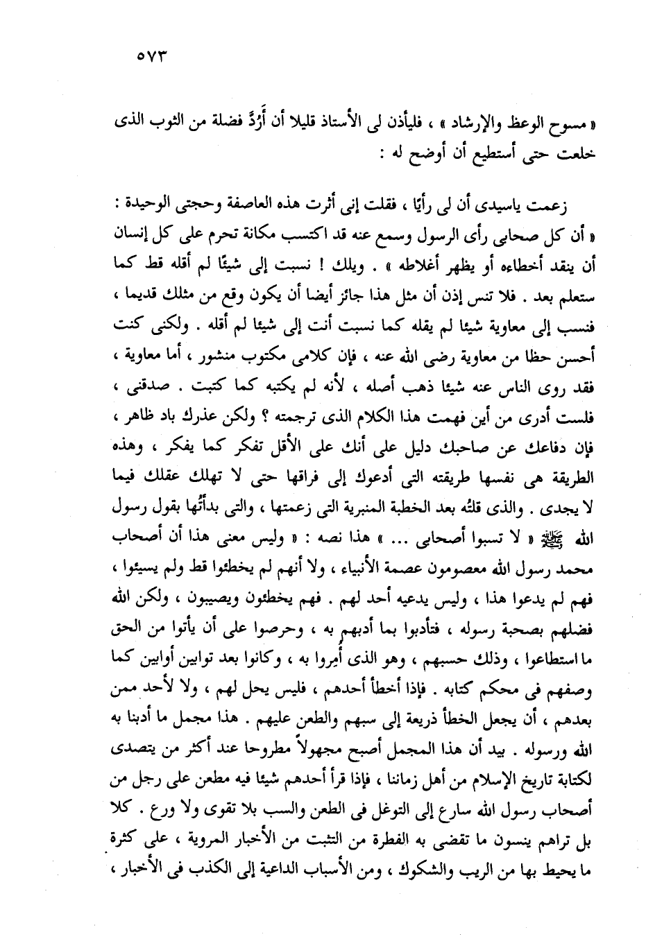زعمت يا سيدي أن لي رأيًا، فقلت إني أثرت هذه العاصفة وحجتي الوحيدة: "أن كل صحابى رأى الرسول وسمع عنه قد اكتسب مكانة تحرم على كل إنسان أن ينقد أخطاءه أو يظهر أغلاطه". ويلك! نسبت إلى شيئًا لم أقله قط كما ستعلم بعد. فلا تنس إذن أن مثل هذا جائز أيضًا أن يكون وقع من مثلك قديما، فنسب إلى معاوية شيئا لم يقله كما نسبت أنت إلى شيئا لم أقله. ولكني كنت أحسن حظا من معاوية - رضي الله عنه -، فإن كلامي مكتوب منشور، أما معاوية، فقد روى الناس عنه شيئا ذهب أصله، لأنه لم يكتبه كما كتبت. صدقنى، فلست أدري من أين فهمت هذا الكلام الذي ترجمته؟ ولكن عذرك باد ظاهر، فإن دفاعك عن صاحبك دليل على أنك على الأقل تفكر كما يفكر، وهذه الطريقة هي نفسها طريقته التي أدعوك إلى فراقها حتى لا تهلك عقلك فيما لا يجدى. والذي قلتُه بعد الخطبة المنبرية التي زعمتها، والتي بدأتُها بقول رسول الله - صلى الله عليه وسلم - "لا تسبوا أصحابي. . . ." هذا نصه: "وليس معنى هذا أن أصحاب محمد رسول الله معصومون عصمة الأنبياء، ولا أنهم لم يخطئوا قط ولم يسيئوا، فهم لم يدعوا هذا، وليس يدعيه أحد لهم. فهم يخطئون ويصيبون، ولكن الله فضلهم بصحبة رسوله، فتأدبوا بما أدبهم به، وحرصوا على أن يأتوا من الحق ما استطاعوا، وذلك حسبهم، وهو الذي أُمِروا به، وكانوا بعد توابين أوابين كما وصفهم في محكم كتابه. فإذا أخطأ أحدهم، فليس يحل لهم، ولا لأحد ممن بعدهم، أن يجعل الخطأ ذريعة إلى سبهم والطعن عليهم. هذا مجمل ما أدبنا به الله ورسوله. بيد أن هذا المجمل أصبح مجهولًا مطروحا عند أكثر من يتصدى لكتابة تاريخ الإسلام من أهل زماننا، فإذا قرأ أحدهم شيئا فيه مطعن على رجل من أصحاب رسول الله سارع إلى التوغل في الطعن والسب بلا تقوى ولا ورع. كلا بل تراهم ينسون ما تقضى به الفطرة من التثبت من الأخبار المروية، على كثرة ما يحيط بها من الريب والشكوك، ومن الأسباب الداعية إلى الكذب في الأخبار،