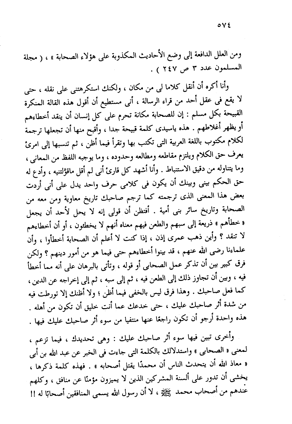 وأنا أكره أن أنقل كلاما لي من مكان، ولكنك استكرهتنى على نقله، حتى لا يقع في عقل أحد من قراء الرسالة، أنى مستطع أن أقول هذه القالة المنكرة القبيحة بكل مسلم: إن للصحابة مكانة تحرم على كل إنسان أن ينقد أخطاءهم أو يظهر أغلاطهم. هذه يا سيدي كلمة قبيحة جدا، وأقبح منها أن تجعلها ترجمة لكلام مكتوب باللغة العربية التي تكتب بها وتقرأ فيما أظن، ثم تنسبها إلى امرئ يعرف حق الكلام ويلتزم مقاطعه ومطالعه وحدوده، وما يوجبه اللفظ من المعاني، وما يتناوله من دقيق الاستنباط. وأنا أشهد كل قارئ أنى لم أقل ما قوَّلتنيه، وأدع له حق الحكم بيني وبينك أن يكون في كلامي حرف واحد يدل على أنى أردت بعض هذا المعنى الذي ترجمته كما ترجم صاحبك تاريخ معاوية ومن معه من الصحابة وتاريخ سائر بنى أمية. أفتظن أن قولى إنه لا يحل لأحد أن يجعل "خطأهم" ذريعة إلى سبهم والطعن فيهم معناه أنهم لا يخطئون، أو أن أخطاءهم لا تنقد؟ وأين ذهب عمري إذن، إذا كنت لا أعلم أن الصحابة أخطأوا، وأن علماءنا -رضي الله عنهم-، قد بينوا أخطاءهم حتى فيما هو من أمور دينهم؟ ولكن فرق كبير بين أن تذكر عمل الصحابي أو قوله، وتأتي بالبرهان على أنه مما أخطأ فيه، وبين أن تجاوز ذلك إلى الطعن فيه، ثم إلى سبه، ثم إلى إخراجه عن الدين، كما فعل صاحبك. وهذا فرق ليس بالخفي فيما أظن؛ ولا أظنك إلا تورطت فيه من شدة أثر صاحبك عليك، حتى خدعك عما أنت خليق أن تكون من أهله. هذه واحدة أرجو أن تكون راجعا عنها منتفيا من سوء أثر صاحبك عليك فيها.