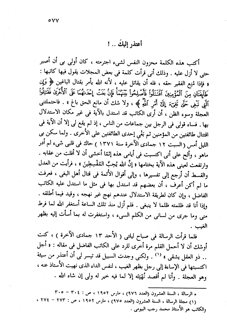أكتب هذه الكلمة محزون النفس لشيء اجترمته، كان أولى بي أن أصبر حتى لا أزل عليه. وذلك أني قرأت كلمة في بعض المجلات يقول فيها كاتبها: "فإذا مُنِع الفقير حقه، فله أن يقاتل عليه، لأنه الله يأمر بقتال الباغين {وَإِنْ طَائِفَتَانِ مِنَ الْمُؤْمِنِينَ اقْتَتَلُوا فَأَصْلِحُوا بَيْنَهُمَا فَإِنْ بَغَتْ إِحْدَاهُمَا عَلَى الْأُخْرَى فَقَاتِلُوا الَّتِي تَبْغِي حَتَّى تَفِيءَ إِلَى أَمْرِ اللَّهِ} , ولا شك أَن مانع الحق باغ". فاحتملتنى العجلة وسوء الظن، أن أرى الكاتب قد استدل بالآية في غير مكان الاستدلال بها. فساء قولى في الرجل بين جماعات من الناس، إذ لم يقع لي إلا أن الآية في اقتتال طائفتين من المؤمنين ثم بَغْي إحدى الطائفتين على الأخرى. ولما سكن بى الليل أمس (السبت 12 جمادى الآخرة سنة 1371) حاك في قلبي شيء لم أدر ما هو، وألح على أنى اكتسبت في أيامى هذه إثمًا أخشى أن لا أفلت من عقابه. وارتفعت لعيني هذه الآية بختامها {إِنَّ اللَّهَ يُحِبُّ الْمُقْسِطِينَ}، فرأيت من العدل والقسط أن أرجع إلى تفسيرها، وإلى أقوال الأئمة في قتال أهل البغي، فعرفت ما لم أكن أعرف، أن بعضهم قد استدل بها في مثل ما استدل عليه الكاتب الفاضل، وإن كان لطريقة الاستدلال عندهم نهج غير نهجه، وقيد فيما أطلقه. وإذا أنا قد ظلمته ظلما لا ينبغي. فلم أزل منذ تلك الساعة أستغفر الله لما فرط مني وما جرى من لسانى من الكلم السئ، واستغفرت له بما أسأت إليه بظهر الغيب.