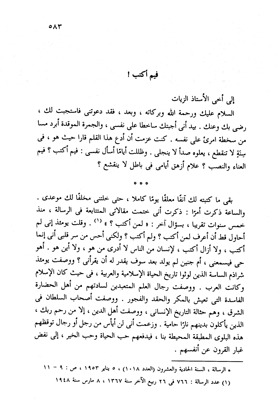بقى ما كتبته لك آنفًا معلقًا يومًا كاملا، حتى خلتنى مخلفًا لك موعدى. والساعة ذكرت أمرًا: ذكرت أنى ختمت مقالاتى المتتابعة في الرسالة، منذ خمس سنوات تقريبا، بسؤال آخر: "لمن أكتب؟ " (¬1). وقلت يومئذ إني لم أحاول قط أن أعرف لمن أكتب؟ ولم أكتب؟ ولكني أحس من سر قلبي أنى إنما أكتب، ولا أزال أكتب، لإنسان من الناس لا أدري من هو، ولا أين هو. أهو حي فيسمعني، أم جنين لم يولد بعد سوف يقدر له أن يقرأنى؟ ووصفت يومئذ شراذم الساسة الذين لوثوا تاريخ الحياة الإسلامية والعربية، في حيث كان الإسلام وكانت العرب. ووصفت رجال العلم المتعبدين لسادتهم من أهل الحضارة الفاسدة التي تعيش بالمكر والحقد والفجور. ووصفت أصحاب السلطان في الشرق، وهم حثالة التاريخ الإنساني، ووصفت أهل الدين، إلا من رحم ربك، الذين يأكلون بدينهم نارًا حامية. وزعمت أنى لن أيأس من رجل أو رجال توقظهم هذه البلوى المطبقة المحيطة بنا، فيدفعهم حب الحياة وحب الخير، إلى نفض غبار القرون عن أنفسهم.