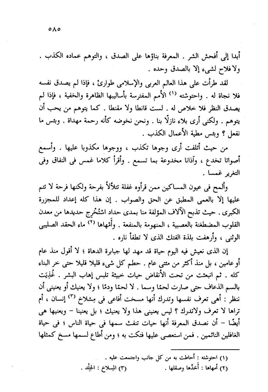 لقد طرأت على هذا العالم العربي والإسلامي طوارئ، فإذا لم يصدق نفسه فلا نجاة له. واحتوشته (¬1) الأمم المفترسة بأساليبها الظاهرة والخفية، فإذا لم يصدق النظر فلا خلاص له. لست قانطا ولا مقنطا. كما يتوهم من يحب أن يتوهم. ولكني أرى بلاء نازلًا بنا. ونحن نخوضه كأنه رحمة مهداة. وبئس ما نفعل؟ وبئس مطية الأعمال الكذب.