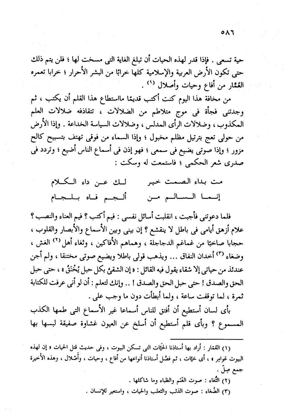 من مخافة هذا اليوم كنت أكتب قديمًا ما استطاع هذا القلم أن يكتب، ثم وجدتني فجأة في موج متلاطم من الضلالات، تتقاذفه ضلالات العلم المكذوب، وضلالات الرأي المدلس، وضلالات السياسة الخداعة. وإذا الأرض من حولي تعج بترتيل مظلم مخبول؛ وإذا السماء من فوقى تهتف بتسبيح كالح مزور؛ وإذا صوتى يضيع في سمعى؛ فهو إذن في أسماع الناس أضيع؛ وتردد في صدري شعر الحكمى؛ فاستمعت له وسكت: