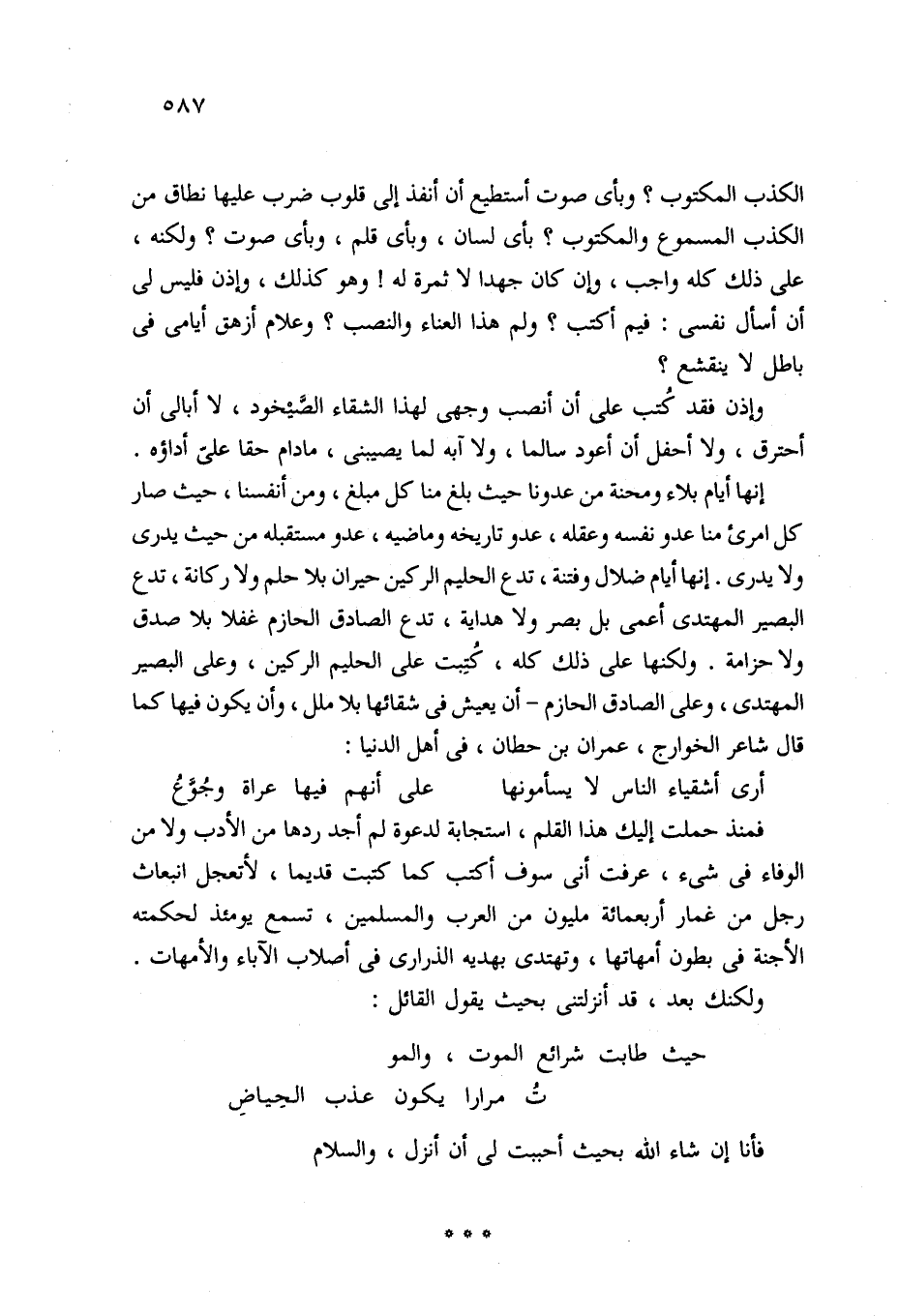وإذن فقد كُتب على أن أنصب وجهي لهذا الشقاء الصَّيْخود، لا أبالي أن أحترق، ولا أحفل أن أعود سالما، ولا آبه لما يصيبني، مادام حقا عليّ أداؤه. إنها أيام بلاء ومحنة من عدونا حيث بلغ منا كل مبلغ، ومن أنفسنا، حيث صار كل امرئ منا عدو نفسه وعقله، عدو تاريخه وماضيه، عدو مستقبله من حيث يدرى ولا يدرى. إنها أيام ضلال وفتنة، تدع الحليم الركين حيران بلا حلم ولا ركانة، تدع البصير المهتدي أعمى بلا بصر ولا هداية، تدع الصادق الحازم غفلا بلا صدق ولا حزامة. ولكنها على ذلك كله، كُتِبت على الحليم الركين، وعلى البصير المهتدى، وعلى الصادق الحازم -أن يعيش في شقائها بلا ملل، وأن يكون فيها كما قال شاعر الخوارج، عمران بن حطان، في أهل الدنيا: