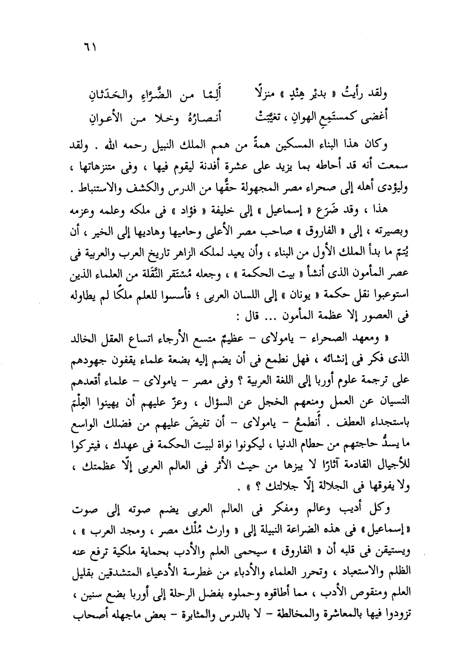 "ومعهد الصحراء -يا مولاي- عظيمٌ متسع الأرجاء اتساع العقل الخالد الذي فكر في إنشائه، فهل نطمع في أن يضم إليه بضعة علماء يقفون جهودهم على ترجمة علوم أوربا إلى اللغة العربية؟ وفي مصر -يا مولاي- علماء أقعدهم النسيان عن العمل ومنعهم الخجل عن السؤال، وعزّ عليهم أن يهينوا العِلْمَ باستجداء العطف. أَنطمعُ -يا مولاي- أن تفيضَ عليهم من فضلك الواسع ما يسدُّ حاجتهم من حطام الدنيا، ليكونوا نواة لبيت الحكمة في عهدك، فيتركوا للأجيال القادمة آثارًا لا يبزها من حيث الأثر في العالم العربي إلّا عظمتك، ولا يفوقها في الجلالة إلّا جلالتك؟ ".