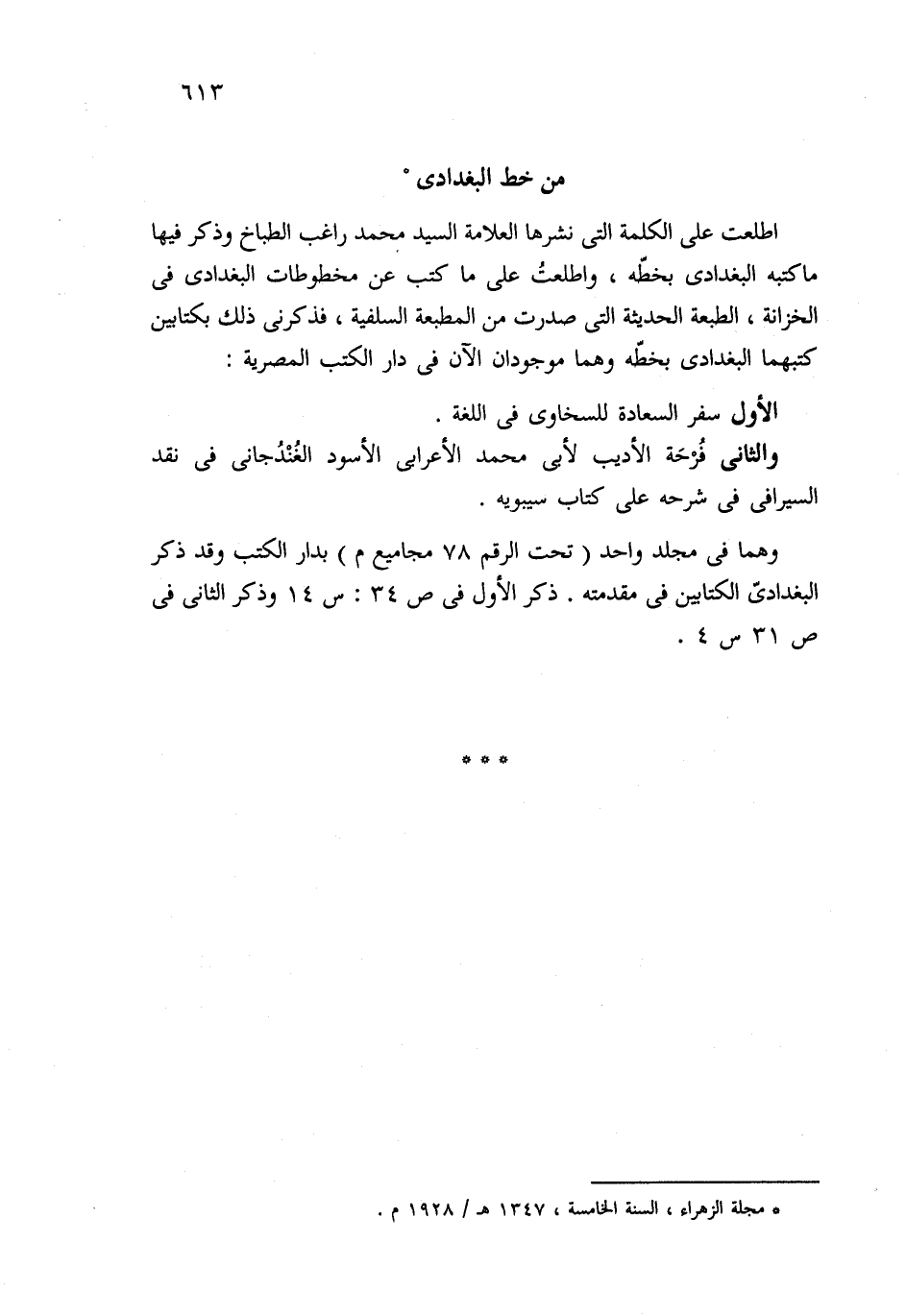 اطلعت على الكلمة التي نشرها العلامة السيد محمد راغب الطباخ وذكر فيها ما كتبه البغدادي بخطّه، واطلعتُ على ما كتب عن مخطوطات البغدادي في الخزانة، الطبعة الحديثة التي صدرت من المطبعة السلفية، فذكرنى ذلك بكتابين كتبهما البغدادي بخطّه وهما موجودان الآن في دار الكتب المصرية: