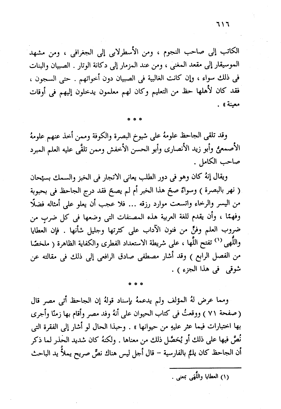 ويقال إنهُ كان وهو في دور الطلب يعانى الاتجار في الخبز والسمك بسيْحان (نهر بالبصرة) وسواءٌ صحّ هذا الخبر أم لم يصحّ فقد درج الجاحظ في بحبوبة من اليسر والرخاء واتسعت موارد رزقه. . . فلا عجب أن يعلو على أمثاله فضلًا وفهمًا، وأن يقدم للغة العربية هذه المصنفات التي وضعها في كل ضربٍ من ضروب العلم وفنٍّ من فنون الآداب على كثرتها وجليل شأنها. فإن العطايا واللُّهى (¬1) تفتح اللَّها، على شريطة الاستعداد الفطرى والكفاية الظاهرة (ملخصًا من الفصل الرابع) وقد أشار مصطفى صادق الرافعي إلى ذلك في مقالته عن شوقى في هذا الجزء).