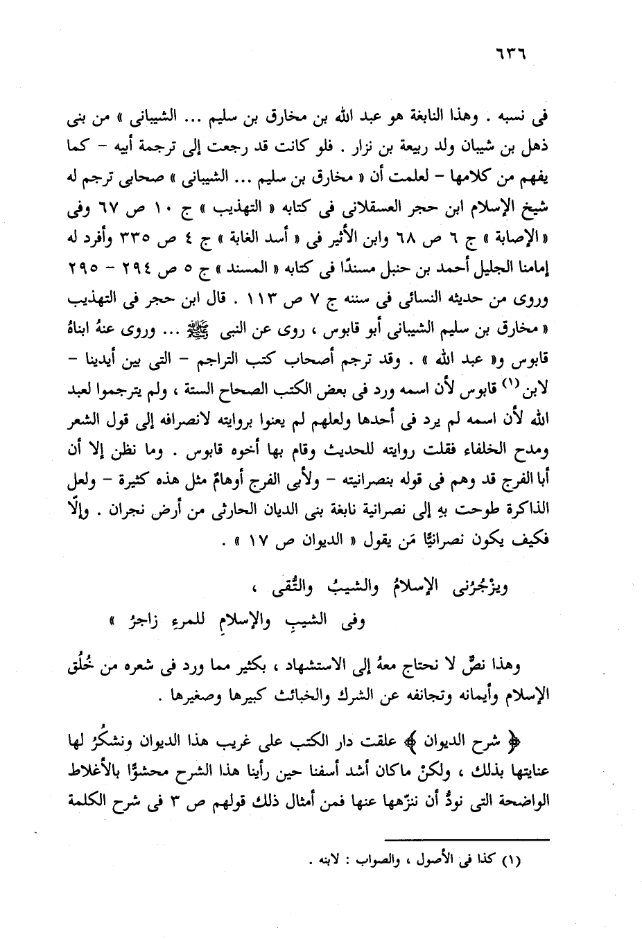 في نسبه. وهذا النابغة هو عبد الله بن مخارق بن سليم. . . الشيباني" من بنى ذهل بن شيبان ولد ربيعة بن نزار. فلو كانت قد رجعت إلى ترجمة أبيه -كما يفهم من كلامها- لعلمت أن "مخارق بن سليم. . . الشيبانى" صحابي ترجم له شيخ الإسلام ابن حجر العسقلانى في كتابه "التهذيب" ج 10 ص 67 وفي "الإصابة" ج 6 ص 68 وابن الأثير في "أسد الغابة" ج 4 ص 335 وأفرد له إمامنا الجليل أحمد بن حنبل مسندًا في كتابه "المسند" ج 5 ص 294 - 295 وروى من حديثه النسائى في سننه ج 7 ص 113. قال ابن حجر في التهذيب "مخارق بن سليم الشيبانى أبو قابوس، روى عن النبي - صلى الله عليه وسلم -. . . وروى عنهُ ابناهُ قابوس و"عبد الله". وقد ترجم أصحاب كتب التراجم -التي بين أيدينا- لابن (¬1) قابوس لأن اسمه ورد في بعض الكتب الصحاح الستة، ولم يترجموا لعبد الله لأن اسمه لم يرد في أحدها ولعلهم لم يعنوا بروايته لانصرافه إلى قول الشعر ومدح الخلفاء فقلت روايته للحديث وقام بها أخوه قابوس. وما نظن إلا أن أبا الفرج قد وهم في قوله بنصرانيته -ولأبي الفرج أوهامٌ مثل هذه كثيرة- ولعل الذاكرة طوحت بهِ إلى نصرانية نابغة بنى الديان الحارثى من أرض نجران. وإلا فكيف يكون نصرانيًّا مَن يقول "الديوان ص 17".