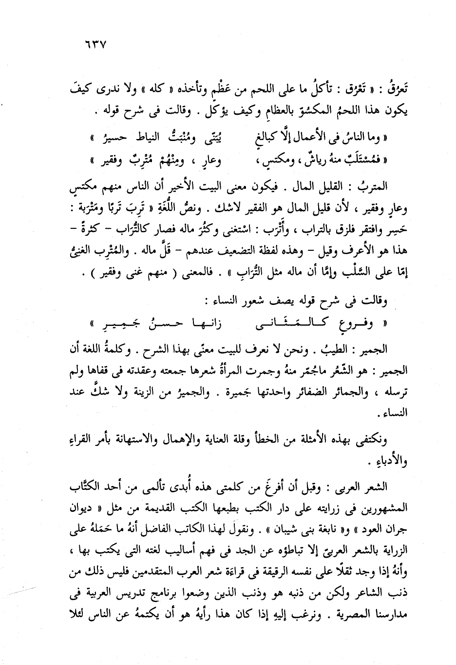 الشعر العربي: وقبل أن أفرغَ من كلمتى هذه أُبدى تألمى من أحد الكتَّاب المشهورين في زرايته على دار الكتب بطبعها الكتب القديمة من مثل "ديوان جران العود" و"نابغة بنى شيبان". ونقول لهذا الكاتب الفاضل أنهُ ما حَمَلهُ على الزراية بالشعر العربيّ إلا تباطؤه عن الجد في فهم أساليب لغته التي يكتب بها، وأنهُ إذا وجد ثقلًا على نفسه الرقيقة في قراءَة شعر العرب المتقدمين فليس ذلك من ذنب الشاعر ولكن من ذنبه هو وذنب الذين وضعوا برنامج تدريس العربية في مدارسنا المصرية. ونرغب إليهِ إذا كان هذا رأيهُ هو أن يكتمهُ عن الناس لئلا