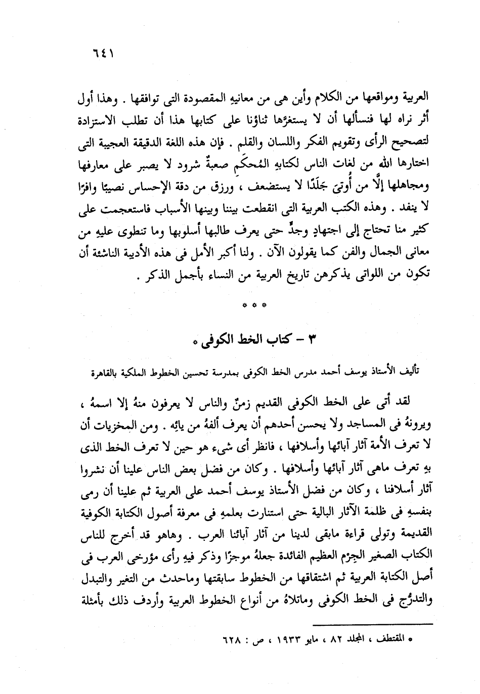 لقد أتى على الخط الكوفي القديم زمنٌ والناس لا يعرفون منهُ إلا اسمهُ، ويرونهُ في المساجد ولا يحسن أحدهم أن يعرف ألفهُ من يائِه. ومن المِخزيات أن لا تعرف الأمة آثار آبائها وأسلافها، فانظر أي شيء هو حين لا تعرف الخط الذي بهِ تعرف ما هي آثار آبائها وأسلافها. وكان من فضل بعض الناس علينا أن نشروا آثار أسلافنا، وكان من فضل الأستاذ يوسف أحمد على العربية ثم علينا أن رمى بنفسهِ في ظلمة الآثار البالية حتى استنارت بعلمهِ في معرفة أصول الكتابة الكوفية القديمة وتولى قراءة ما بقي لدينا من آثار آبائنا العرب. وها هو قد أخرج للناس الكتاب الصغير الجِرْم العظيم الفائدة جعلهُ موجزًا وذكر فيهِ رأي مؤرخي العرب في أصل الكتابة العربية ثم اشتقاقها من المخطوط سابقتها وما حدث من التغير والتبدل والتدرُّج في الخط الكوفي وما تلاهُ من أنواع الخطوط العربية وأردف ذلك بأمثلة