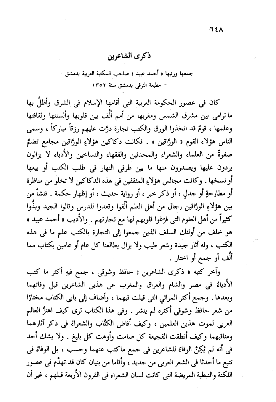 كان في عصور الحكومة العربية التي أقامها الإسلام في الشرق وأظلَّ بها ما ترامى بين مشرق الشمس ومغربها من أمم ألَّف بين قلوبها وألسنتها وثقافتها وعلمها، قومٌ قد اتخذوا الورق والكتب تجارة درَّت عليهم رزقًا مباركًا، وسمى الناس هؤلاء القوم "الورَّاقين". فكانت دكاكين هؤلاءِ الورَّاقين مجامع تضمُّ صفوةً من العلماء والشعراء والمحدثين والفقهاء والنساخين والأدباء لا يزالون يردون عليها ويصدرون منها ما بين طرفي النهار في طلب الكتب أو بيعها أو نسخها. وكانت مجالس هؤلاءِ المثقفين في هذه الدكاكين لا تخلو من مناظرة أو مطارحةٍ أو جدلٍ، أو ذكر خبر، أو رواية حديث، أو إظهار حكمة. فنشأ من بين هؤلاءِ الورَّاقين رجال من أهل العلم ألّفوا وقعدوا للدرس وقالوا الجيد وبذُّوا كثيرًا من أهل العلوم التي فرّغوا قلوبهم لها مع تجارتهم. والأديب "أحمد عبيد" هو خلف من أولئك السلف الذين جمعوا إلى التجارة بالكتب علم ما في هذه الكتب، وله آثار جيدة وشعر طيب ولا يزال يطالعنا كل عام أو عامين بكتاب مما ألَّف أو جمع أو اختار.