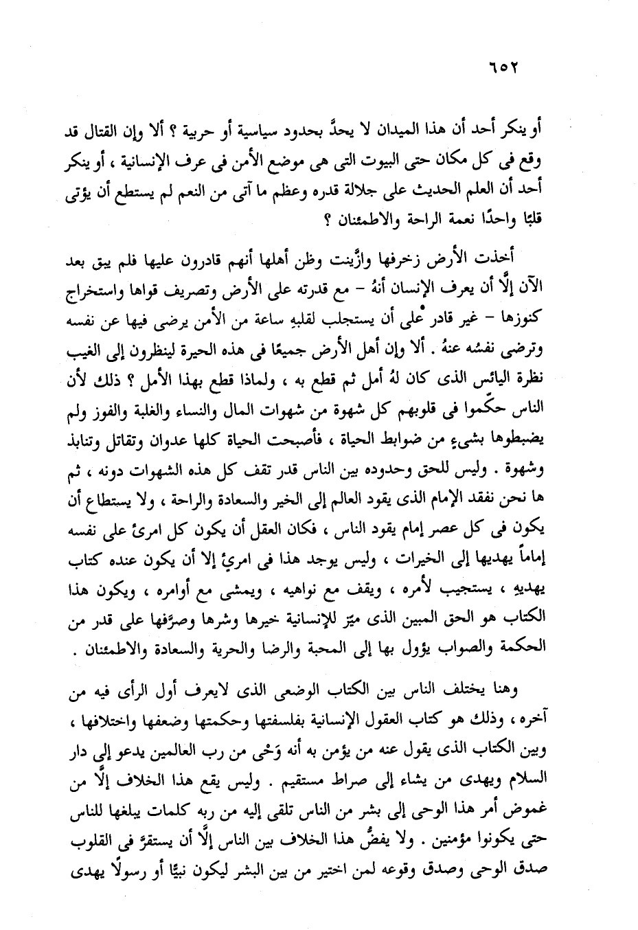 أخذت الأرض زخرفها وازَّينت وظن أهلها أنهم قادرون عليها فلم يبق بعد الآن إلاَّ أن يعرف الإنسان أنهُ -مع قدرته على الأرض وتصريف قواها واستخراج كنوزها- غير قادر على أن يستجلب لقلبهِ ساعة من الأمن يرضى فيها عن نفسه وترضى نفسُه عنهُ. ألا وإن أهل الأرض جميعًا في هذه الحيرة لينظرون إلى الغيب نظرة اليائس الذي كان لهُ أمل ثم قطع به، ولماذا قطع بهذا الأمل؟ ذلك لأن الناس حكّموا في قلوبهم كل شهوة من شهوات المال والنساء والغلبة والفوز ولم يضبطوها بشيءٍ من ضوابط الحياة، فأصبحت الحياة كلها عدوان وتقاتل وتنابذ وشهوة. وليس للحق وحدوده بين الناس قدر تقف كل هذه الشهوات دونه، ثم ها نحن نفقد الإمام الذي يقود العالم إلى الخير والسعادة والراحة، ولا يستطاع أن يكون في كل عصر إمام يقود الناس، فكان العقل أن يكون كل امرئ على نفسه إمامًا يهديها إلى الخيرات، وليس يوجد هذا في امرئٍ إلا أن يكون عنده كتاب يهديهِ، يستجيب لأمره، ويقف مع نواهيه، ويمشي مع أوامره، ويكون هذا الكتاب هو الحق المبين الذي ميّز للإنسانية خيرها وشرها وصرَّفها على قدر من الحكمة والصواب يؤول بها إلى المحبة والرضا والحرية والسعادة والاطمئنان.
