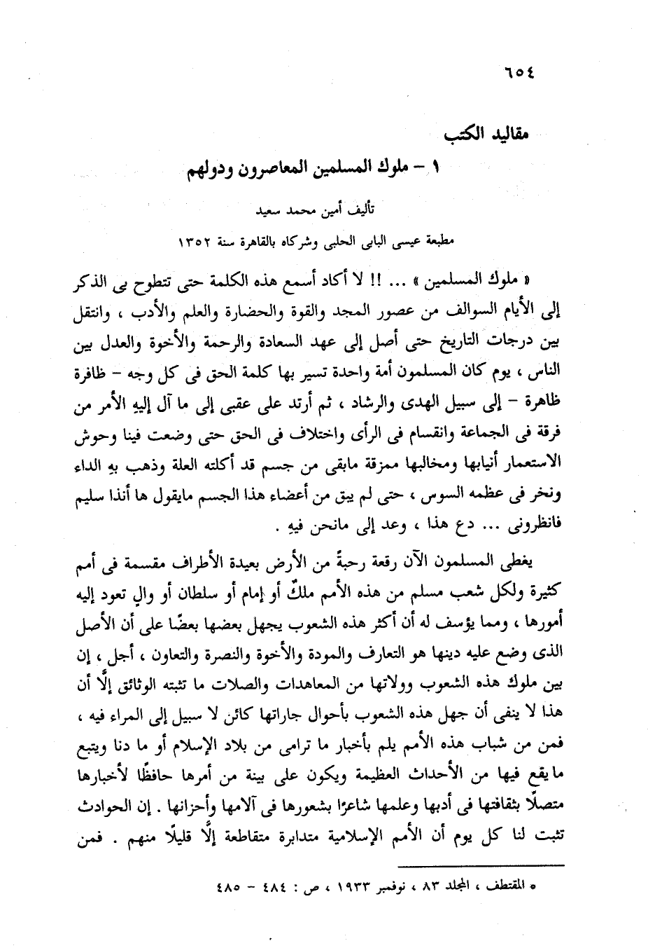 "ملوك المسلمين". . . .! ! لا أكاد أسمع هذه الكلمة حتى تتطوح بي الذكر إلى الأيام السوالف من عصور المجد والقوة والحضارة والعلم والأدب، وانتقل بين درجات التاريخ حتى أصل إلى عهد السعادة والرحمة والأخوة والعدل بين الناس، يوم كان المسلمون أمة واحدة تسير بها كلمة الحق في كل وجه -ظافرة ظاهرة- إلى سبيل الهدى والرشاد، ثم أرتد على عقبى إلى ما آله إليه الأمر من فرقة في الجماعة وانقسام في الرأي واختلاف في الحق حتى وضعت فينا وحوش الاستعمار أنيابها ومخالبها ممزقة ما بقي من جسم قد أكلته العلة وذهب بهِ الداء ونخر في عظمه السوس، حتى لم يبق من أعضاء هذا الجسم ما يقول هاأنذا سليم فانظرونى. . . دع هذا، وعد إلى ما نحن فيه.
