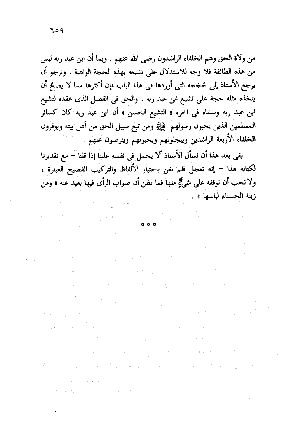 من ولاة الحق وهم الخلفاء الراشدون رضى الله عنهم. وبما أن ابن عبد ربه ليس من هذه الطائفة فلا وجه للاستدلال على تشيعه بهذه الحجة الواهية. ونرجو أن يرجع الأستاذ إلى حُجَجه التي أوردها في هذا الباب فإن أكثرها مما لا يصحُّ أن يتخذه مثله حجة على تشيع ابن عبد ربه. والحق في الفصل الذي عقده لتشيع ابن عبد ربه وسماه في آخره "التشيع الحسن" أن ابن عبد ربه كان كسائر المسلمين الذين يحبون رسولهم - صلى الله عليه وسلم - ومن تبع سبيل الحق من أهل بيته ويوقرون الخلفاء الأربعة الراشدين ويبجلونهم ويحبونهم ويترضون عنهم.