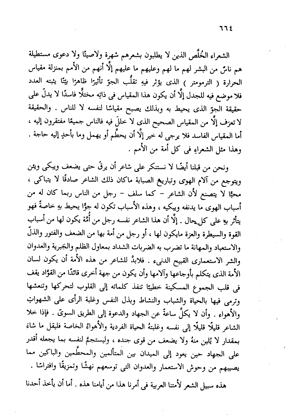 ونحن من قبلنا أيضًا لا نستنكر على شاعر أن يرقّ حتى يضعف ويبكى ويئن ويتوجع من آلام الهوى وتباريح الصبابة ما كان ذلك الشاعر صادقًا لا يتباكى، محبًّا لا يتصنع لأن الشاعر -كما سلف- رجل من الناس ربما كان له من أسباب الهوى ما يدنفه ويبكيه، وهذه الأسباب تكون له جوًّا يحيط بهِ خاصةً فهو يتأثر به على كل حال. إلَّا أن هذا الشاعر نفسه رجل من أُمَّة يكون لها من أسباب القوة والسيطرة والعزة ما يكون لها، أو رجل من أمة بها من الضعف والفتور والذلّ والاستعباد والمهانة ما تضرب به الضربات الشداد بمعاول الظلم والجَبرية والعدوان والشر الاستعمارى القبيح الدنئ. فلابدَّ للشاعر من هذه الأمة أن يكون لسان الأمة الذي يتكلم بأوجاعها وآلامها وأن يكون من جهة أخرى قائدًا من القوَّاد يقف في قلب الجموع المسكينة خطيبًا تنفذ كلماته إلى القلوب لتحركها وتنعشها وترمى فيها بالحياة والشباب والنشاط وبذل النفس وغلبة الرأي على الشهواتِ والأهواء. وأن لا يكل ساعة عن الجهاد والدعوة إلى الطريق السوىّ. فإذا خلا الشاعر قليلًا قليلًا إلى نفسه وغلبتهُ الحياة الفردية والأهواءُ الخاصة فليقل ما شاءَ بمقدار لا يُلين منهُ ولا يضعف من قوى جنده، وليستجم لنفسه بما يجعله أقدر على الجهاد حين يعود إلى الميدان بين المتألمين والمحطَّمين والباكين مما يصيبهم من وحوش الاستعمار والعدوان التي توسعهم نهشًا وتمزيقًا وافتراسًا.