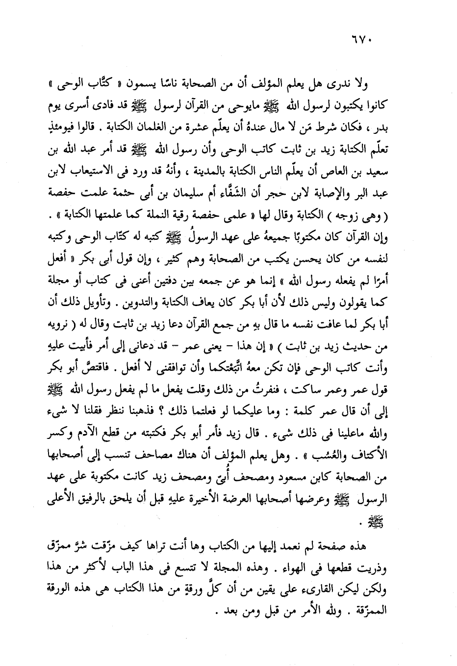 ولا ندري هل يعلم المؤلف أن من الصحابة ناسًا يسمون "كتَّاب الوحي" كانوا يكتبون لرسول الله - صلى الله عليه وسلم - ما يوحى من القرآن لرسول قد فادى أسري يوم بدر، فكان شرط مَن لا مال عندهُ أن يعلّم عشرة من الغلمان الكتابة. قالوا فيومئذٍ تعلَّم الكتابة زيد بن ثابت كاتب الوحي وأن رسول الله - صلى الله عليه وسلم - قد أمر عبد الله بن سعيد بن العاص أن يعلّم الناس الكتابة بالمدينة، وأنهُ قد ورد في الاستيعاب لابن عبد البر والإصابة لابن حجر أن الشَفَّاء أم سليمان بن أبي حثمة علمت حفصة (وهي زوجه) الكتابة وقال لها "علمي حفصة رقية النملة كما علمتها الكتابة". وإن القرآن كان مكتوبًا جميعهُ على عهد الرسولُ - صلى الله عليه وسلم - كتبه له كتّاب الوحي وكتبه لنفسه من كان يحسن يكتب من الصحابة وهم كثير، وإن قول أبي بكر "أفعل أمرًا لم يفعله رسول الله" إنما هو عن جمعه بين دفتين أعني في كتاب أو مجلة كما يقولون وليس ذلك لأن أبا بكر كان يعاف الكتابة والتدوين. وتأويل ذلك أن أبا بكر لما عافت نفسه ما قال بهِ من جمع القرآن دعا زيد بن ثابت وقال له (نرويه من حديث زيد بن ثابت) "إن هذا -يعني عمر- قد دعانى إلى أمر فأبيت عليهِ وأنت كاتب الوحي فإن تكن معهُ اتَّبَعْتكما وأن توافقنى لا أفعل. فاقتصَّ أبو بكر قول عمر وعمر ساكت، فنفرتُ من ذلك وقلت يفعل ما لم يفعل رسول الله - صلى الله عليه وسلم - إلى أن قال عمر كلمة: وما عليكما لو فعلتما ذلك؟ فذهبنا ننظر فقلنا لا شيء والله ما علينا في ذلك شيء. قال زيد فأمر أبو بكر فكتبته من قطع الآدم وكسر الأكتاف والعُسُب". وهل يعلم المؤلف أن هناك مصاحف تنسب إلى أصحابها من الصحابة كابن مسعود ومصحف أُبي ومصحف زيد كانت مكتوبة على عهد الرسول - صلى الله عليه وسلم - وعرضها أصحابها العرضة الأخيرة عليه قبل أن يلحق بالرفيق الأعلى - صلى الله عليه وسلم -.