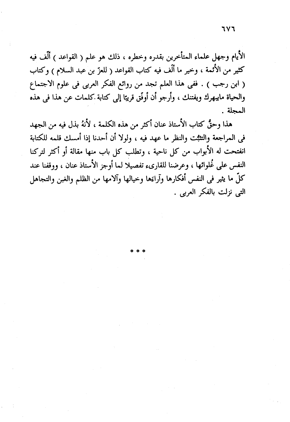 الأيام وجهل علماء المتأخرين بقدره وخطره، ذلك هو علم (القواعد) ألف فيه كثير من الأئمة، وخير ما ألّف فيه كتاب القواعد (للعزّ بن عبد السلام) وكتاب (ابن رجب). ففي هذا العلم تجد من روائع الفكر العربي في علوم الاجتماع والحياة ما يبهرك ويفتنك، وأرجو أن أوفّق قريبًا إلى كتابة كلمات عن هذا في هذه المجلة.