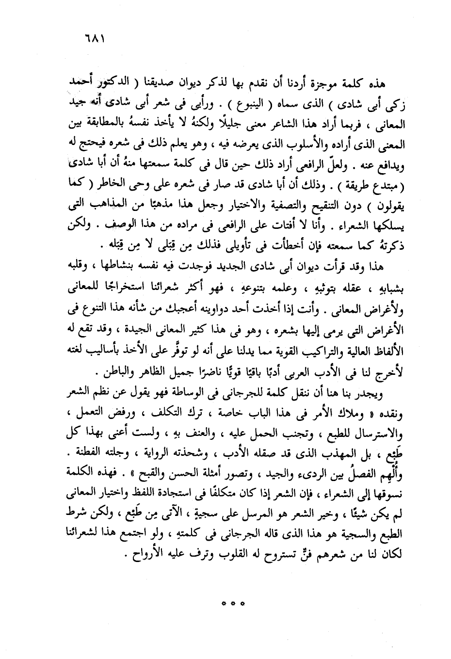 هذه كلمة موجزة أردنا أن نقدم بها لذكر ديوان صديقنا (الدكتور أحمد زكي أبي شادى) الذي سماه (الينبوع). ورأيي في شعر أبي شادى أنه جيد المعاني، فربما أراد هذا الشاعر معنى جليلًا ولكنهُ لا يأخذ نفسهُ بالمطابقة بين المعنى الذي أراده والأسلوب الذي يعرضه فيه، وهو يعلم ذلك في شعره فيحتج له ويدافع عنه. ولعلّ الرافعي أراد ذلك حين قال في كلمة سمعتها منهُ أن أبا شادى (مبتدع طريقة). وذلك أن أبا شادى قد صار في شعره على وحي الخاطر (كما يقولون) دون التنقيح والتصفية والاختيار وجعل هذا مذهبًا من المذاهب التي يسلكها الشعراء. وأنا لا أفتات على الرافعي في مراده من هذا الوصف. ولكن ذكرتهُ كما سمعته فإن أخطأت في تأويلي فذلك مِن قبَلى لا مِن قِبَله.