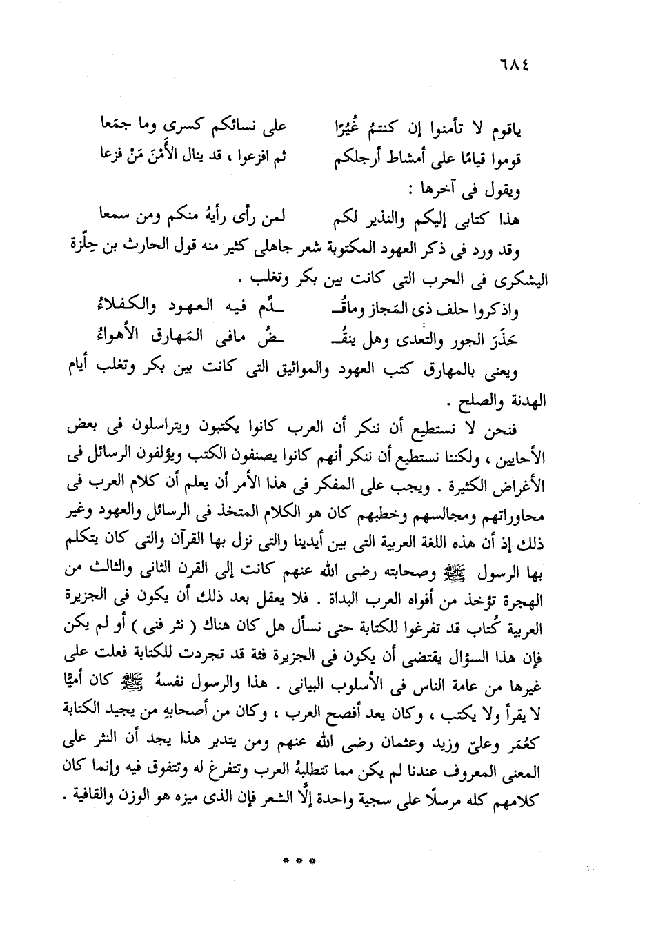 فنحن لا نستطيع أن ننكر أن العرب كانوا يكتبون ويتراسلون في بعض الأحايين، ولكننا نستطيع أن ننكر أنهم كانوا يصنفون الكتب ويؤلفون الرسائل في الأغراض الكثيرة. ويجب على المفكر في هذا الأمر أن يعلم أن كلام العرب في محاوراتهم ومجالسهم وخطهم كان هو الكلام المتخذ في الرسائل والعهود وغير ذلك إذ أن هذه اللغة العربية التي بين أيدينا والتي نزل بها القرآن والتي كان يتكلم بها الرسول - صلى الله عليه وسلم - وصحابته رضي الله عنهم كانت إلى القرن الثاني والثالث من الهجرة تؤخذ من أفواه العرب البداة. فلا يعقل بعد ذلك أن يكون في الجزيرة العربية كُتاب قد تفرغوا للكتابة حتى نسأل هل كان هناك (نثر فني) أو لم يكن فإن هذا السؤال يقتضي أن يكون في الجزيرة فئة قد تجردت للكتابة فعلت على غيرها من عامة الناس في الأسلوب البيانى. هذا والرسول نفسهُ - صلى الله عليه وسلم - كان أميًّا لا يقرأ ولا يكتب، وكان يعد أفصح العرب، وكان من أصحابهِ من يجيد الكتابة كعُمَر وعلىّ وزيد وعثمان رضي الله عنهم ومن يتدبر هذا يجد أن النثر على المعنى المعروف عندنا لم يكن مما تتطلبهُ العرب وتتفرغ له وتتفوق فيه وإنما كان كلامهم كله مرسلًا على سجية واحدة إلَّا الشعر فإن الذي ميزه هو الوزن والقافية.