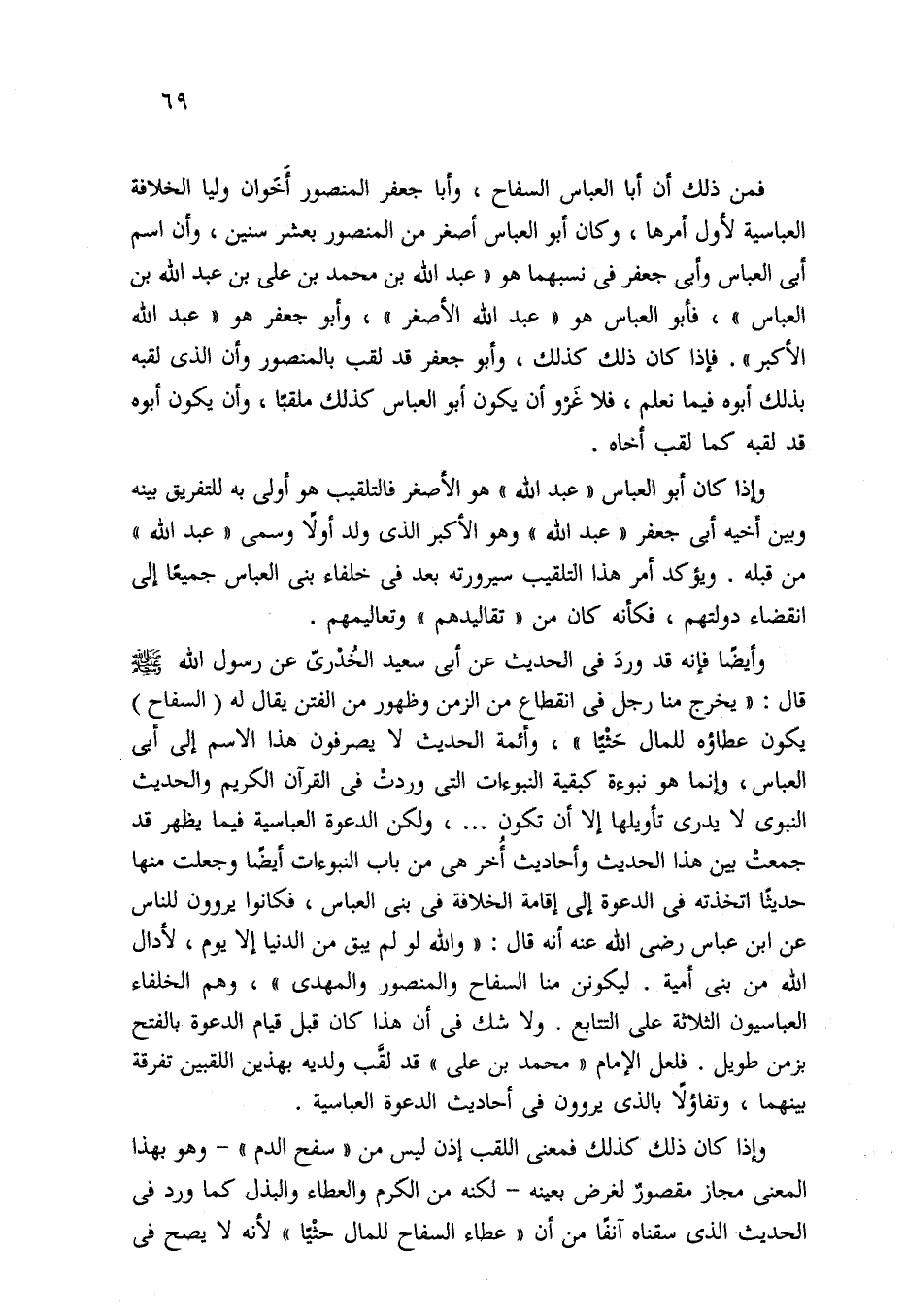 وأيضًا فإنه قد وردَ في الحديث عن أبي سعيد الخُدْري عن رسول الله - صلى الله عليه وسلم - قال: "يخرج منا رجل في انقطاع من الزمن وظهور من الفتن يقال له (السفاح) يكون عطاؤه للمال حَثْيًا"، وأئمة الحديث لا يصرفون هذا الاسم إلى أبي العباس، وإنما هو نبوءة كبقية النبوءات التي وردتْ في القرآن الكريم والحديث النبوي لا يدرى تأويلها إلا أن تكون. . .، ولكن الدعوة العباسية فيما يظهر قد جمعتْ بين هذا الحديث وأحاديث أُخر هي من باب النبوءات أيضًا وجعلت منها حديثًا اتخذته في الدعوة إلى إقامة الخلافة في بني العباس، فكانوا يروون للناس عن ابن عباس - رضي الله عنه - أنه قال: "والله لو لم يبق من الدنيا إلا يوم، لأدال الله من بنى أمية، ليكونن منا السفاح والمنصور والمهدي"، وهم الخلفاء العباسيون الثلاثة على التتابع. ولا شك في أن هذا كان قبل قيام الدعوة بالفتح بزمن طويل. فلعل الإمام "محمد بن علي" قد لقَّب ولديه بهذين اللقبين تفرقة بينهما، وتفاؤلًا بالذي يروون في أحاديث الدعوة العباسية.