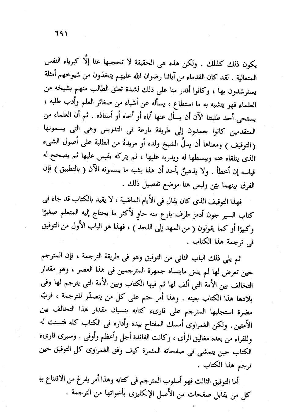 ثم يلى ذلك الباب الثاني من التوفيق وهو في طريقة الترجمة، فإن المترجم حين تعرض لها لم ينسَ ما ينساه جمهرة المترجمين في هذا العصر، وهو مقدار التخالف بين الأمة التي ألف لها ثم فيها الكتاب وبين الأمة التي يترجم لها وفي بلادها هذا الكتاب بعينه. وهذا أمر حتم على كل من يتصدّر للترجمة، فربّ مضرة استجلبها المترجم على قارئ كتابه بنسيان مقدار هذا التخالف بين الأمتين. ولكن الغمراوى أمسك المفتاح بيده وأداره في الكتاب كله فتسنت له وللقراء من بعده مغاليق الرأي، وكانت الفائدة أجل وأعظم وأوفي. وسيرى قارئ الكتاب حين يتمشى في صفحاته المثمرة كيف وفق الغمراوى كل التوفيق حين ترجم هذا الكتاب.