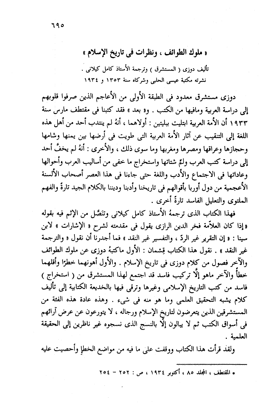 فهذا الكتاب الذي ترجمهُ الأستاذ كامل كيلانى وتنَصَّل من الإثم فيه بقوله "إذا كان العلامة فخر الدين الرازي يقول في مقدمته لشرح "الإشارات" لابن سينا: "إن التقرير غير الردّ، والتفسير غير النقد" فما أجدرنا أن نقول "والترجمة غير النقد". نقول هذا الكتاب قِسْمان: الأول ما كتبهُ دوزى عن ملوك الطوائف والآخر فصول من كلام دوزى في تاريخ الإسلام. والأول أهونهما خطرًا وأقلهما خطأً والآخر ما هو إلا تركيب فاسد قد اجتمع لهذا المستشرق من (استخراج) فاسد من كتب التاريخ الإسلامي وغيرها وترقى فيها بالخديعة الكتابية إلى تأليف كلام يشبه التحقيق العلمي وما هو منه في شيء. وهذه عادة هذه الفئة من المستشرقين الذين يتعرضون لتاريخ الإسلام ورجاله، لا يتورعون عن عرض آرائهم في أسواق الكتب ثم لا يبالون إلا بالنسج الذي نسجوه غير ناظرين إلى الحقيقة العلمية.