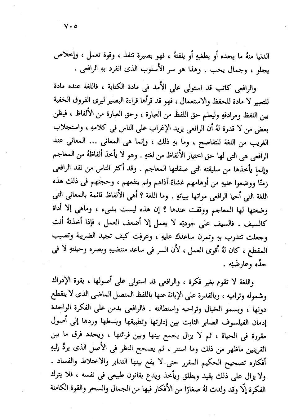 الدنيا منهُ ما يحده أو يطغيهِ أو يلفتهُ، فهو بصيرة تنفذ، وقوة تعمل، وإخلاص يجلو، وجمال يحب. وهذا هو سر الأسلوب الذي انفرد بهِ الرافعي.