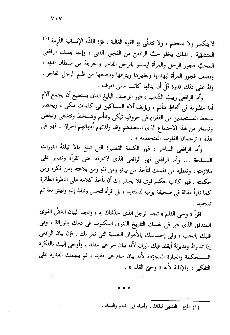 لا ينكسر ولا يتحطم، ولا تتدنَّى بهِ القوة الغالبة، قوّة اللذّة الإنسانية القَرِمة (¬1) المتشهّية. لذلك يخلو حبُّ الرافعيّ من الفجور الفني، وإنما يصف الرافعي المحبُّ فجور الرجل والمرأة ليسمو بالرجل الفاجر ويخرجهُ من سلطان لذتِه، ويصف فجور المرأة ليهديها ويطهرها وينزهها وينصفها من ظلم الرجل الفاجر. ولهُ على ذلك قدرة قَلّ أن ينالها كاتب ممن نعرف.