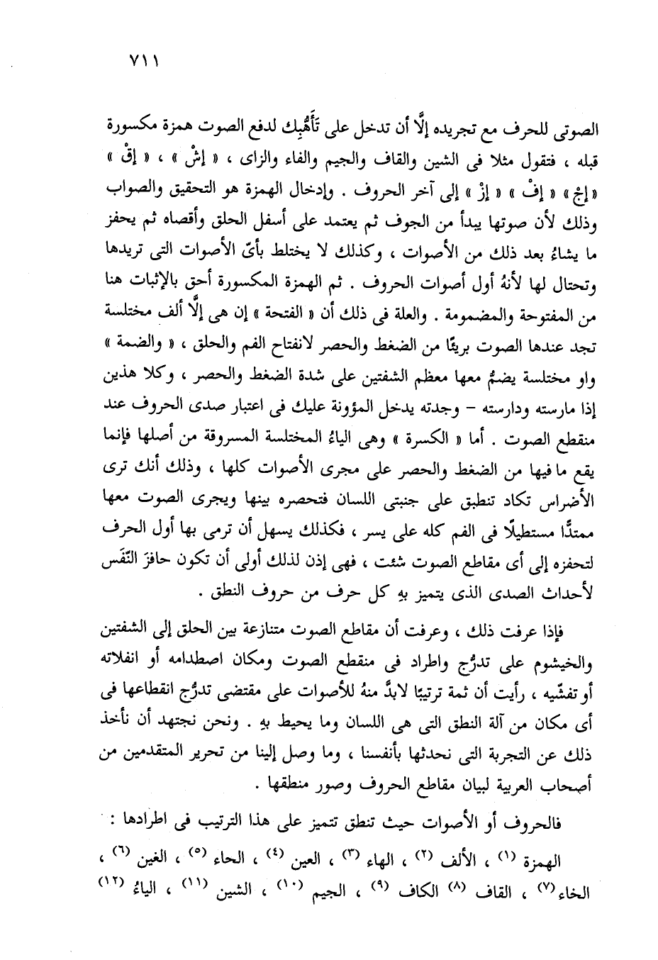فإذا عرفت ذلك، وعرفت أن مقاطع الصوت متنازعة بين الحلق إلى الشفتين والخيشوم على تدرج واطراد في منقطع الصوت ومكان اصطدامه أو انفلاته أو تفشّيه، رأيت أن ثمة ترتيبًا لابدَّ منهُ للأصوات على مقتضى تدرُّج انقطاعها في أي مكان من آلة النطق التي هي اللسان وما يحيط بهِ. ونحن نجتهد أن نأخذ ذلك عن التجربة التي نحدثها بأنفسنا، وما وصل إلينا من تحرير المتقدمين من أصحاب العربية لبيان مقاطع الحروف وصور منطقها.