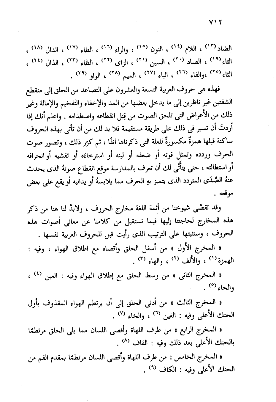 فهذه هي حروف العربية التسعة والعشرون على التصاعد من الحلق إلى منقطع الشفتين غير ناظرين إلى ما يدخل بعضها من المد والإخفاء والتفخيم والإمالة وغير ذلك من الأعراض التي تلحق الصوت من قِبَل انقطاعه واصطدامه. واعلم أنك إذا أردتَ أن تسير في ذلك على طريقة مستقيمة فلابد لك من أن تأتي بهذه الحروف ساكنة قبلها همزةٌ مكسورةٌ للعلة التي ذكرناها آنفًا، ثم كرّر ذلك، وتصور صوت الحرف وردده وتمثل قوته أو ضعفه أو لينه أو استرخاءَه أو تفشيه أو انحرافه أو استطالته، حتى يتأَتَّى لك أن تعرف بالمدارسة موقع انقطاع صوتهُ الذي يحدث عنهُ الصَّدَى المتردد الذي يتميز بهِ الحرف مما يلابسهُ أو يدانيه أو يقع على بعض موقعه.