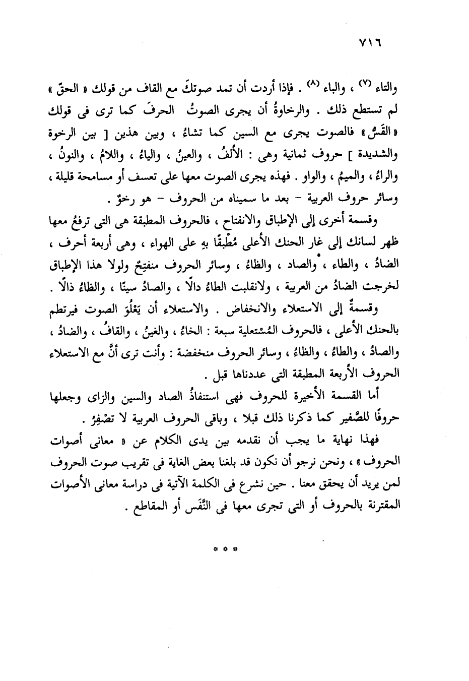 فهذا نهاية ما يجب أن نقدمه بين يدي الكلام عن "معاني أصوات الحروف"، ونحن نرجو أن نكون قد بلغنا بعض الغاية في تقريب صوت الحروف لمن يريد أن يحقق معنا. حين نشرع في الكلمة الآتية في دراسة معاني الأصوات المقترنة بالحروف أو التي تجرى معها في النَّفَس أو المقاطع.