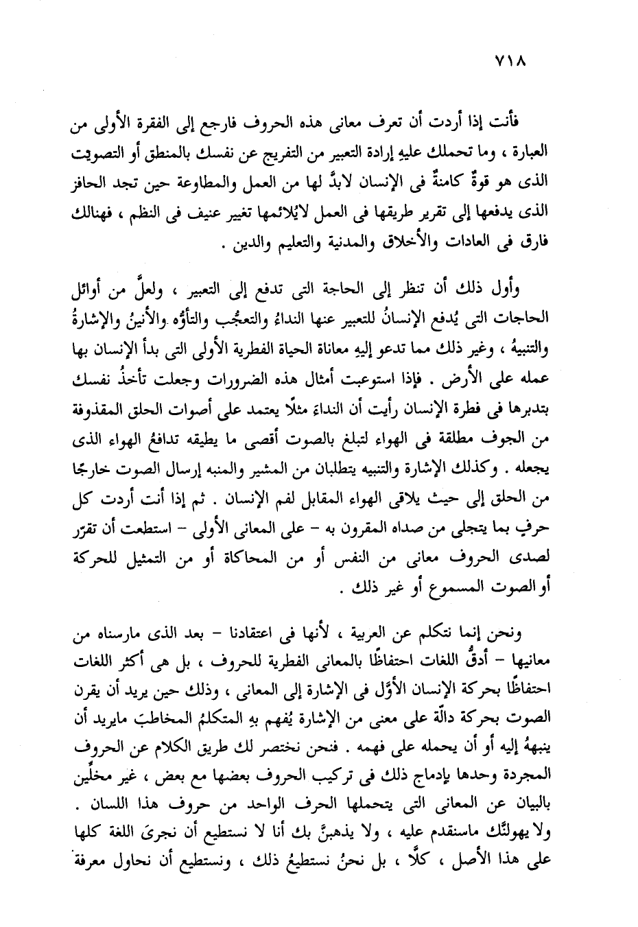 ونحن إنما نتكلم عن العربية، لأنها في اعتقادنا -بعد الذي مارسناه من معانيها- أدقُّ اللغات احتفاظًا بالمعاني الفطرية للحروف، بل هي أكثر اللغات احتفاظًا بحركة الإنسان الأوَّل في الإشارة إلى المعاني، وذلك حين يريد أن يقرن الصوت بحركة دالّة على معنى من الإشارة يُفهم بهِ المتكلمُ المخاطبَ ما يريد أن ينبههُ إليه أو أن يحمله على فهمه. فنحن نختصر لك طريق الكلام عن الحروف المجردة وحدها بإدماج ذلك في تركيب الحروف بعضها مع بعض، غير مخلّين بالبيان عن المعاني التي يتحملها الحرف الواحد من حروف هذا اللسان. ولا يهولنَّك ما سنقدم عليه، ولا يذهبنَّ بك أنا لا نستطيع أن نجرىَ اللغة كلها على هذا الأصل، كلا، بل نحنُ نستطيعُ ذلك، ونستطيع أن نحاول معرفة