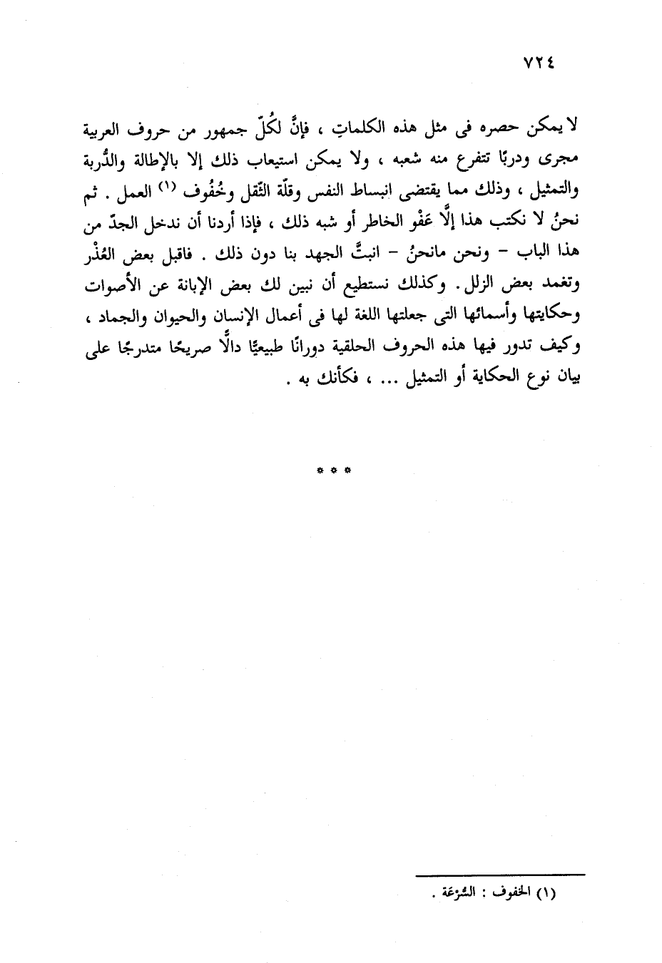 لا يمكن حصره في مثل هذه الكلماتِ، فإنَّ لكُلّ جمهور من حروف العربية مجرى ودربًا تتفرع منه شعبه، ولا يمكن استيعاب ذلك إلا بالإطالة والدُّربة والتمثيل، وذلك مما يقتضي انبساط النفس وقلّة الثّقل وخُفُوف (¬1) العمل. ثم نحنُ لا نكتب هذا إلَّا عَفْو الخاطر أو شبه ذلك، فإذا أردنا أن ندخل الجدّ من هذا الباب -ونحن ما نحنُ- انبتَّ الجهد بنا دون ذلك. فاقبل بعض العُذْر وتغمد بعض الزلل. وكذلك نستطيع أن نبين لك بعض الإبانة عن الأصوات وحكايتها وأسمائها التي جعلتها اللغة لها في أعمال الإنسان والحيوان والجماد، وكيف تدور فيها هذه الحروف الحلقية دورانًا طبيعيًا دالًا صريحًا متدرجًا على بيان نوع الحكاية أو التمثيل. . .، فكأنك به.