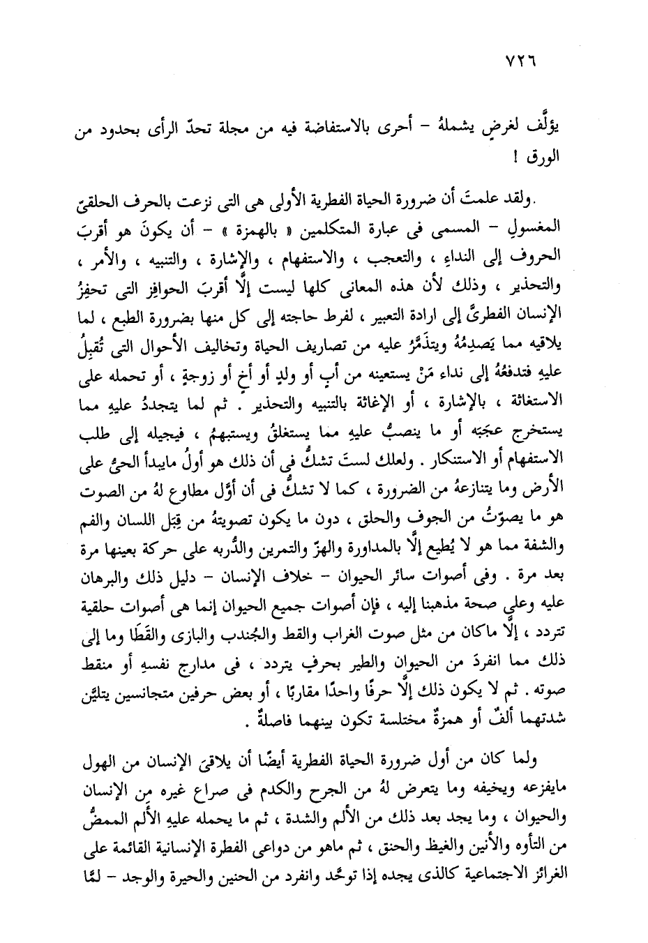 ولقد علمتَ أن ضرورة الحياة الفطرية الأولى هي التي نزعت بالحرف الحلقيّ المغسولِ -المسمى في عبارة المتكلمين "بالهمزة"- أن يكونَ هو أقربَ الحروف إلى النداءِ، والتعجب، والاستفهام، والإشارة، والتنبيه، والأمر، والتحذير، وذلك لأن هذه المعاني كلها ليست إلَّا أقربَ الحوافِز التي تحفِزُ الإنسان الفطريَّ إلى إرادة التعبير، لفرط حاجته إلى كل منها بضرورة الطبع، لما يلاقيه مما يَصدِمُهُ ويتذَمَّرُ عليه من تصاريف الحياة وتخاليف الأحوال التي تُقبِلُ عليهِ فتدفعُهُ إلى نداء مَنْ يستعينه من أبٍ أو ولدٍ أو أخٍ أو زوجةٍ، أو تحمله على الاستغاثة، بالإشارة، أو الإغاثة بالتنبيه والتحذير. ثم لما يتجددُ عليهِ مما يستخرج عجَبَه أو ما ينصبُّ عليهِ مما يستغلقُ ويستبهمُ، فيجيله إلى طلب الاستفهام أو الاستنكار. ولعلك لستَ تشكُّ في أن ذلك هو أولُ ما يبدأ الحيُّ على الأرض وما يتنازعهُ من الضرورة، كما لا تشكُّ في أن أوّل مطاوع لهُ من الصوت هو ما يصوّتُ من الجوف والحلق، دون ما يكون تصويتهُ من قِبَل اللسان والفم والشفة مما هو لا يُطيع إلَّا بالمداورة والهز والتمرين والدُّربه على حركة بعينها مرة بعد مرة. وفي أصوات سائر الحيوان -خلاف الإنسان- دليل ذلك والبرهان عليه وعلى صحة مذهبنا إليه، فإن أصوات جميع الحيوان إنما هي أصوات حلقية تتردد، إلا ما كان من مثل صوت الغراب والقط والجُندب والبازى والقَطا وما إلى ذلك مما انفردَ من الحيوان والطير بحرفٍ يتردد، في مدارج نفسهِ أو منقط صوته. ثم لا يكون ذلك إلَّا حرفًا واحدًا مقاربًا، أو بعض حرفين متجانسين يتليَّن شدتهما ألفٌ أو همزةٌ مختلسة تكون بينهما فاصلةٌ.