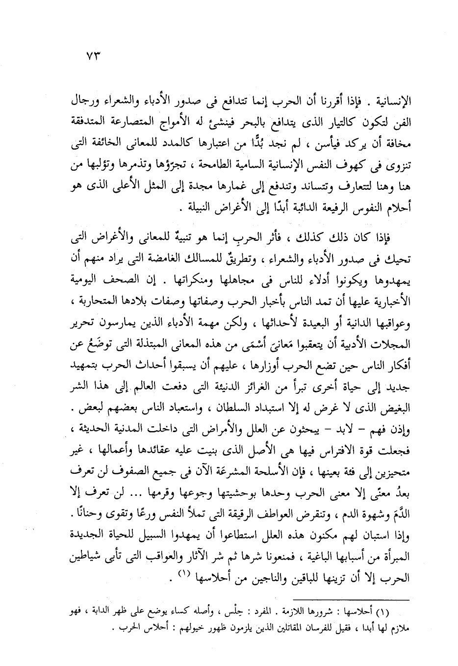 الإنسانية. فإذا أقررنا أن الحرب إنما تتدافع في صدور الأدباء والشعراء ورجال الفن لتكون كالتيار الذي يتدافع بالبحر فينشئ له الأمواج المتصارعة المتدفقة مخافة أن يركد فيأسن، لم نجد بُدًّا من اعتبارها كالمدد للمعاني الخائفة التي تنزوي في كهوف النفس الإنسانية السامية الطامحة، تجرّؤها وتذمرها وتؤلبها من هنا وهنا لتتعارف وتتساند وتندفع إلى غمارها مجدة إلى المثل الأعلى الذي هو أحلام النفوس الرفيعة الدائبة أبدًا إلى الأغراض النبيلة.
