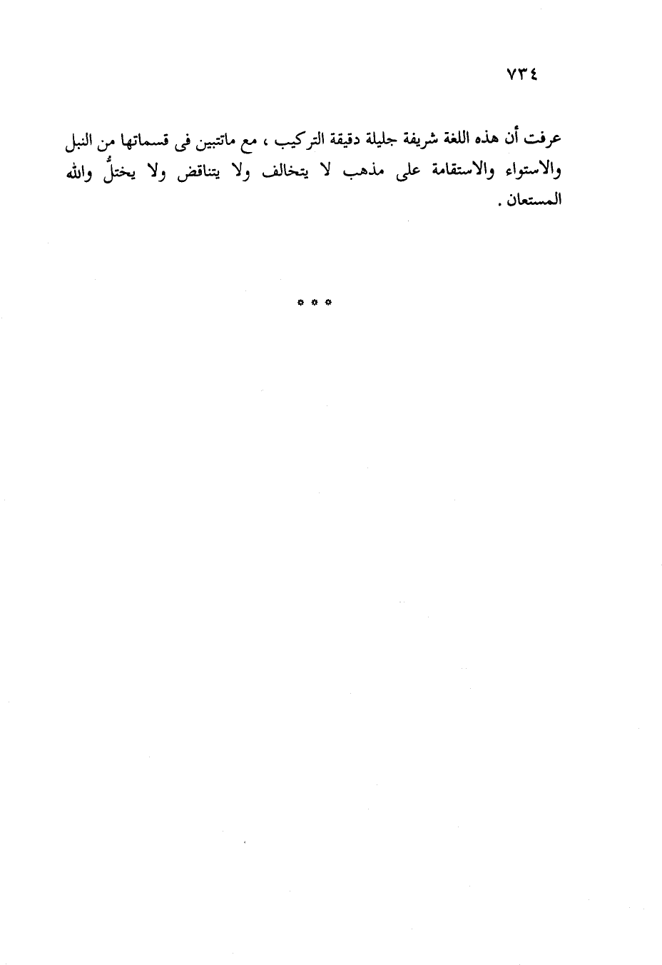 عرفت أن هذه اللغة شريفة جليلة دقيقة التركيب، مع ما تتبين في قسماتها من النبل والاستواء والاستقامة على مذهب لا يتخالف ولا يتناقض ولا يختل والله المستعان.