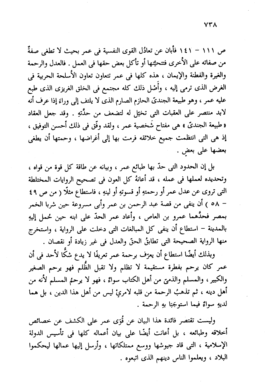 ص 111 - 141 فأبان عن تعادُل القوى النفسية في عمر بحيث لا تطغى صفةٌ من صفاته على الأخرى فتتحيَّنها أو تأكل بعض حقها في العمل. فالعدل والرحمة والغيرة والفطنة والإيمان، هذه كلها في عمر تتعاون تعاون الأسلحة الحربية في الغرض الذي ترمى إليه، وأَصل ذلك كله مجتمع في الخلق الغريزى الذي طبع عليه عمر، وهو طبيعة الجنديّ الحازم الصارم الذي لا يلتف إلى وراءَ إذا عرف أنَّه لابد منتصر على العقبات التي تخيّل له لتضعف من حدَّتهِ. وقد جعل العقاد "طبيعة الجندي" هي مفتاح شخصية عمر، ولقد وفق في ذلك أحسن التوفيق، إذ هي التي انتظمت جميع خلائقه فرمت بها إلى أغراضها، وحمتها أن يطغى بعضها على بعضٍ.