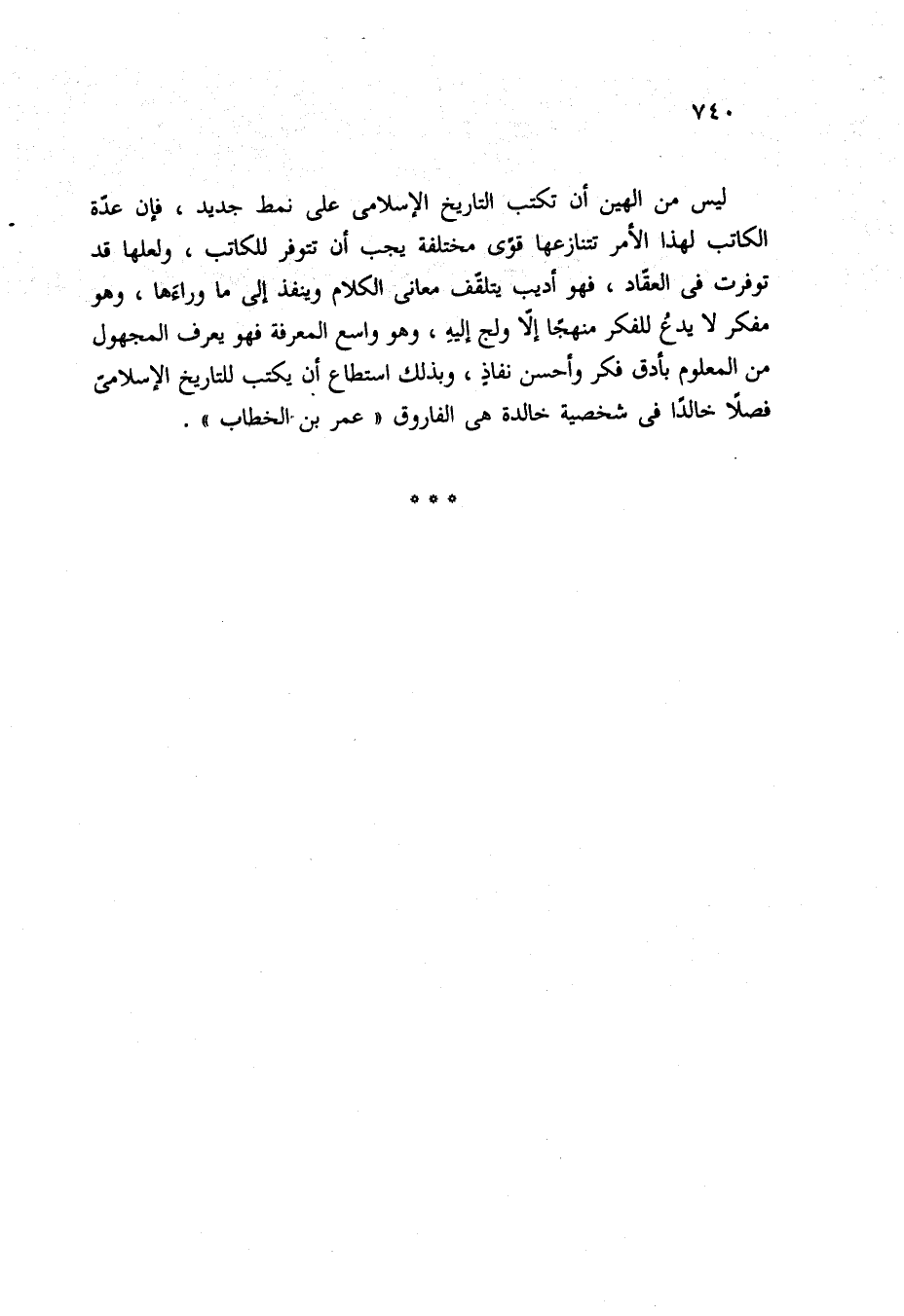 ليس من الهين أن تكتب التاريخ الإسلامي على نمط جديد، فإن عدّة الكاتب لهذا الأمر تتنازعها قوى مختلفة يجب أن تتوفر للكاتب، ولعلها قد توفرت في العقّاد، فهو أديب يتلقّف معاني الكلام وينفذ إلى ما وراءَها، وهو مفكر لا يدعُ للفكر منهجًا إلَّا ولج إليهِ، وهو واسع المعرفة فهو يعرف المجهول من المعلوم بأدق فكر وأحسن نفاذٍ، وبذلك استطاع أن يكتب للتاريخ الإسلامي فصلًا خالدًا في شخصية خالدة هي الفاروق "عمر بن الخطاب".
