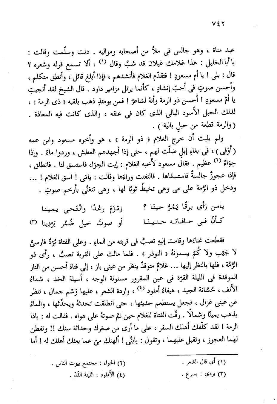 ولم يلبث أن خرج الغلام "ذو الرمة"، هو وأخوه مسعود وابن عمه (أوْفى)، في بغاءِ إبلٍ ضلّت لهم، حتى إذا أجهدهم العطش، وردوا ماءً. وإذا حِواءٌ (¬2) عظيم. فقال مسعود لأخيه الغلام: إيت الحِوَاء فاستسق لنا. فانطلق، فإذا عجوزٌ جالسةٌ فاستسقاها. فالتفتت وراءَها وقالت: يا مَي! اسق الغلام! . . . ودخل ذو الرُّمة على مي وهي تخيطُ ثوبًا لها، وهي تتغنَّى بأرخم صوتٍ.