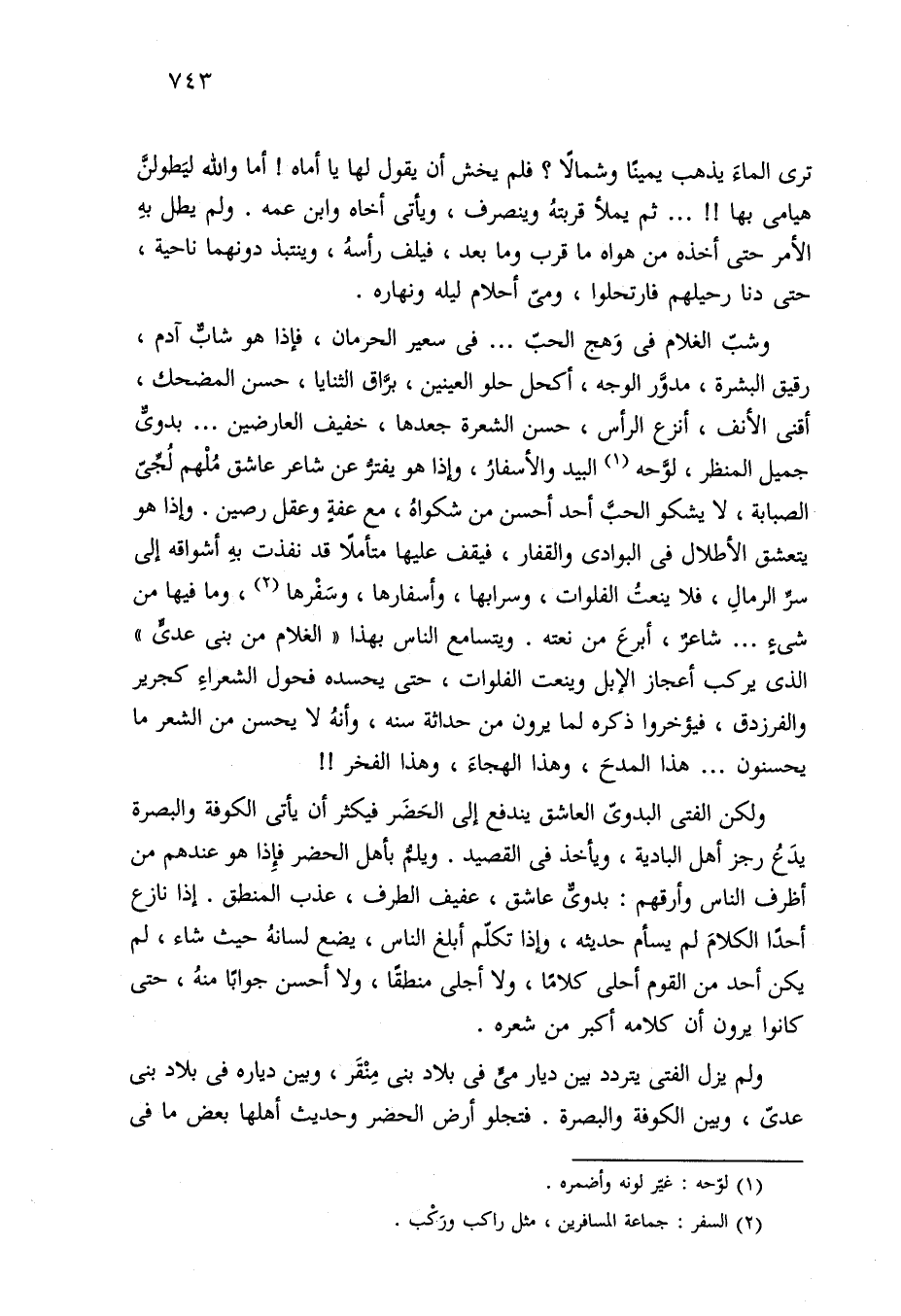 ولكن الفتى البدويّ العاشق يندفع إلى الحَضَر فيكثر أن يأتي الكوفة والبصرة يدَعُ رجز أهل البادية، ويأخذ في القصيد. ويلم بأهل الحضر فإِذا هو عندهم من أظرف الناس وأرقهم: بدويٌّ عاشق، عفيف الطرف، عذب المنطق. إذا نازع أحدًا الكلامَ لم يسأم حديثه، وإذا تكلّم أبلغ الناس، يضع لسانهُ حيث شاء، لم يكن أحد من القوم أحلى كلامًا، ولا أجلي منطقًا، ولا أحسن جوابًا منهُ، حتى كانوا يرون أن كلامه أكبر من شعره.