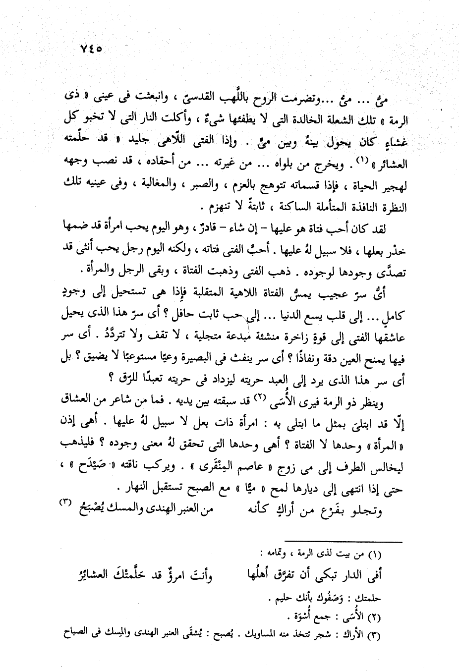 ميُّ. . . ميُّ. . . وتضرمت الروح باللَّهب القدسى، وانبعثت في عيني "ذي الرمة" تلك الشغلة الخالدة التي لا يطفئها شيءٌ، وأكلت النار التي لا تخبو كل غشاءٍ كان يحول بينة وبين ميّ. وإذا الفتى اللاهي جليد "قد حلّمته العشائر" (¬1). ويخرج من بلواه. . . من غيرته. . . من أحقاده، قد نصب وجهه لهجير الحياة، فإذا قسماته تتوهج بالعزم، والصبر، والمغالبة، وفي عينيه تلك النظرة النافذة المتأملة الساكنة، ثابتةً لا تنهزم.