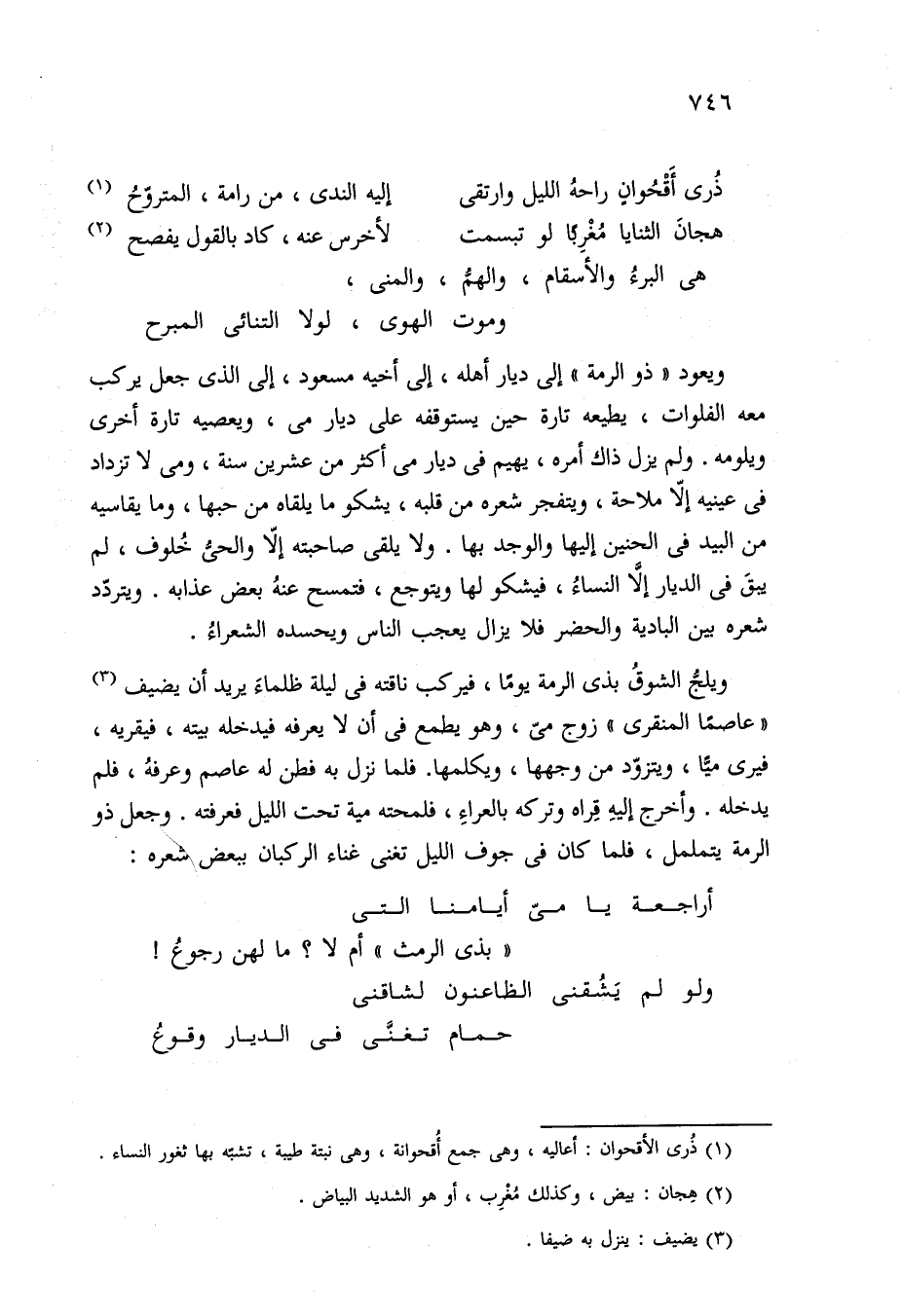 ويلجُّ الشوقُ بذى الرمة يومًا، فيركب ناقته في ليلة ظلماءَ يريد أن يضيف (¬3) "عاصمًا المنقرى" زوج ميّ، وهو يطمع في أن لا يعرفه فيدخله بيته، فيقريه، فيرى ميًّا، ويتزوّد من وجهها، ويكلمها. فلما نزل به فطن له عاصم وعرفهُ، فلم يدخله. وأخرج إليهِ قراه وتركه بالعراءِ، فلمحته مية تحت الليل فعرفته. وجعل ذو الرمة يتململ، فلما كان في جوف الليل تغنى غناء الركبان ببعض شعره: