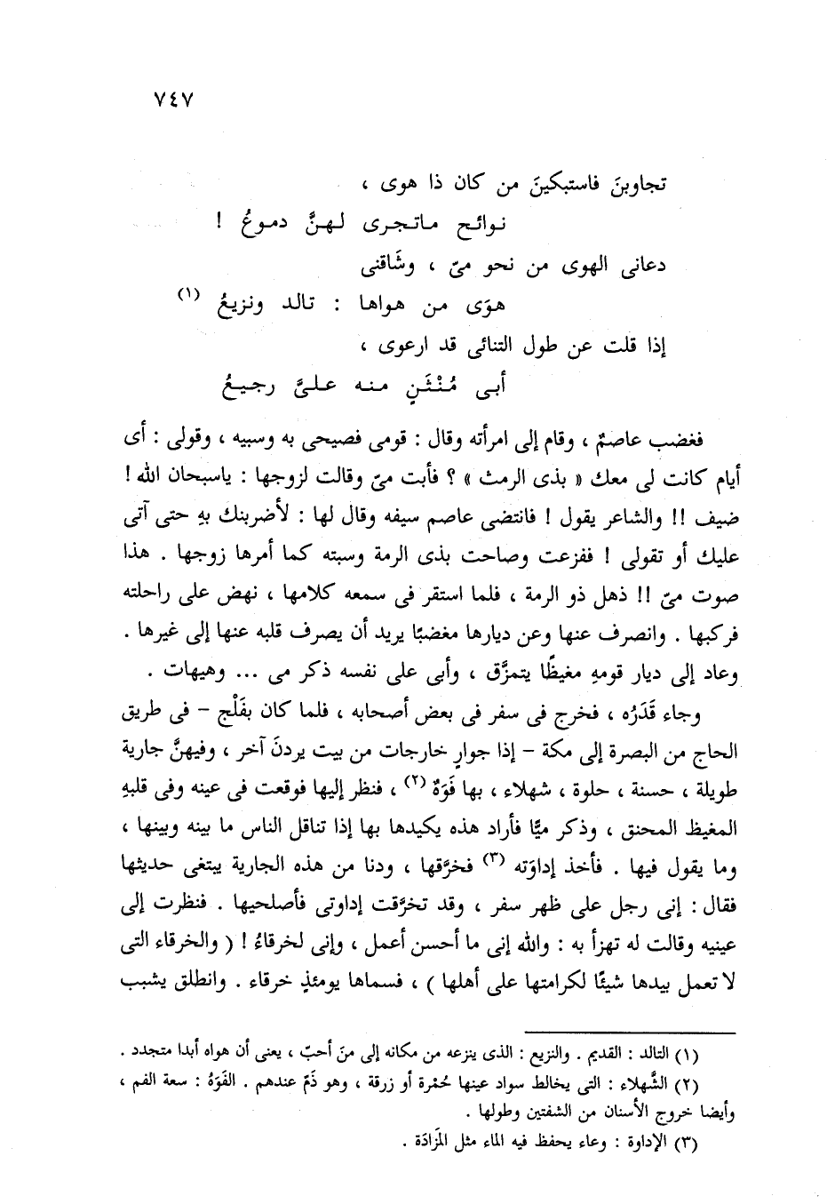وجاء قَدَرُه، فخرج في سفر في بعض أصحابه، فلما كان بفَلْج -في طريق الحاج من البصرة إلى مكة- إذا جوارٍ خارجات من بيت يردنَ آخر، وفيهنَّ جارية طويلة، حسنة، حلوة، شهلاء، بها فَوَهٌ (¬2)، فنظر إليها فوقعت في عينه وفي قلبهِ المغيظ المحنق، وذكر ميًّا فأراد هذه يكيدها بها إذا تناقل الناس ما بينه وبينها، وما يقول فيها. فأخذ إداوَته (¬3) فخرَّقها، ودنا من هذه الجارية يبتغى حديثها فقال: إني رجل على ظهر سفر، وقد تخرّقت إداوتى فأصلحيها. فنظرت إلى عينيه وقالت له تهزأ به: والله إني ما أحسن أعمل، وإني لخرقاءُ! (والخرقاء التي لا تعمل بيدها شيئًا لكرامتها على أهلها)، فسماها يومئذٍ خرقاء. وانطلق يشبب